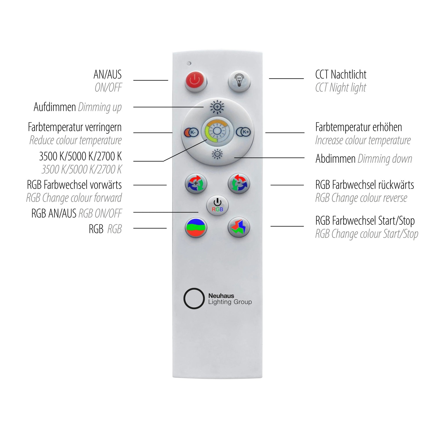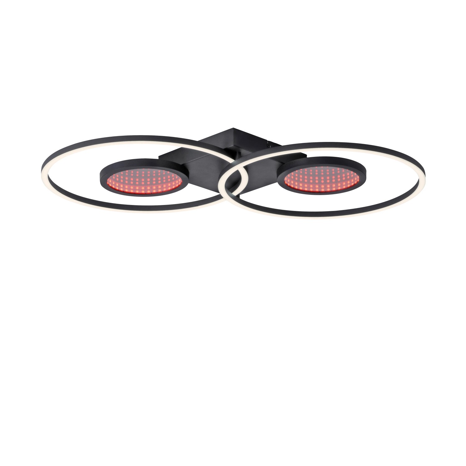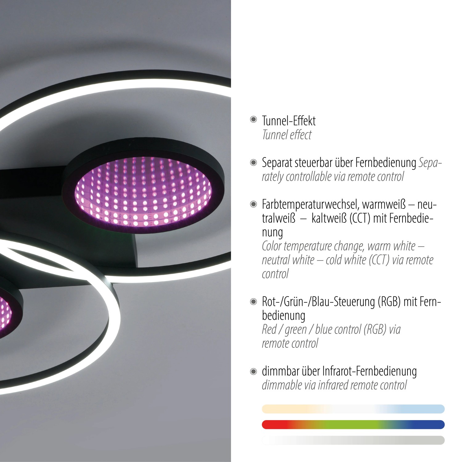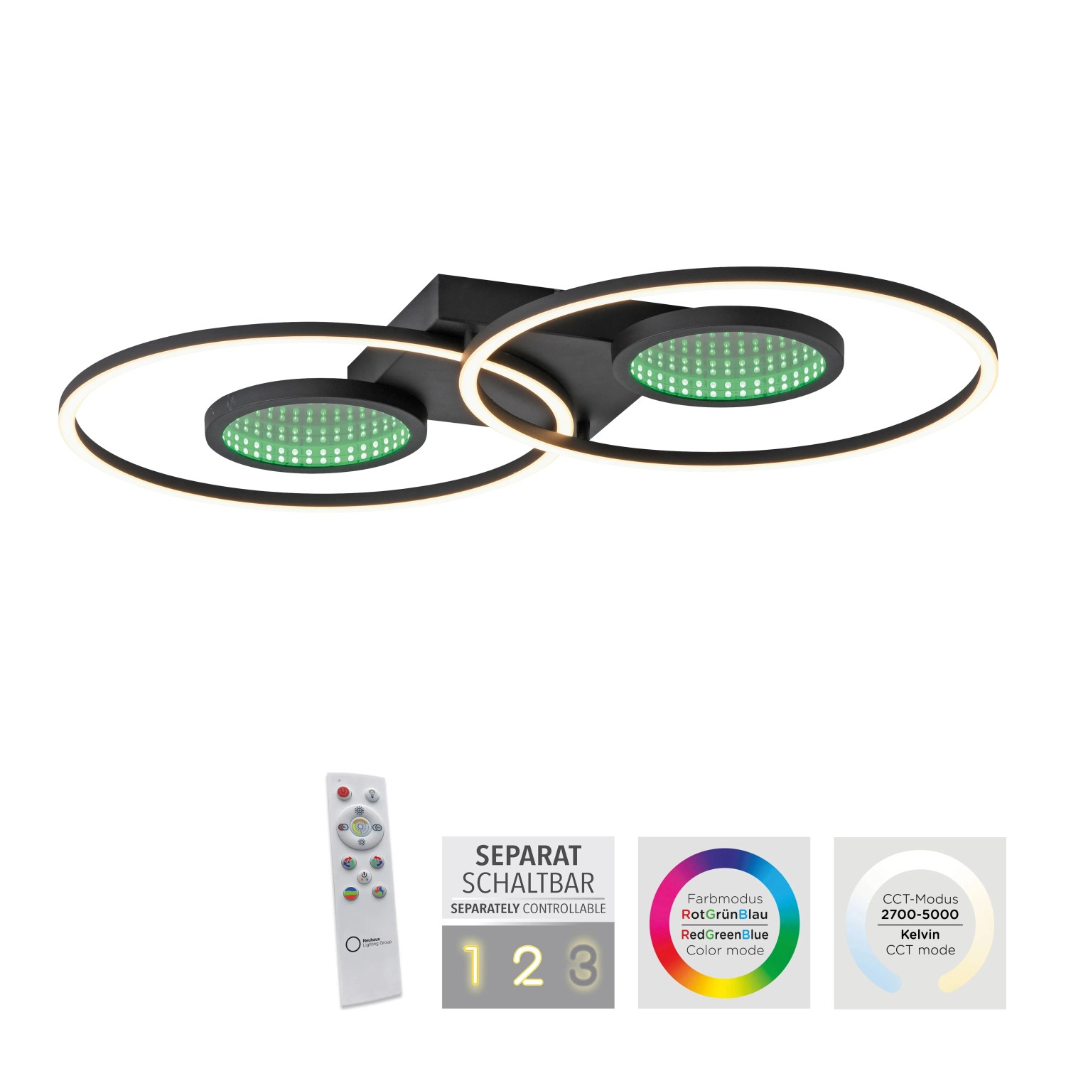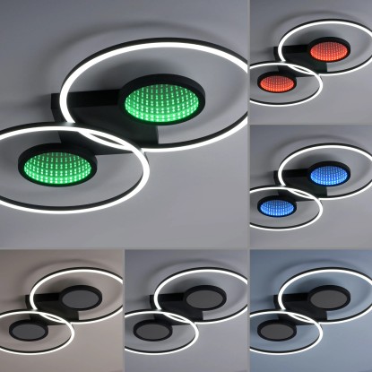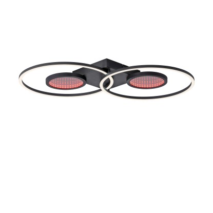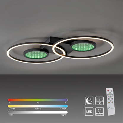 Svítidlo navíc nabízí světelný zdroj RGB, který nabízí širokou škálu barevných možností. Světelný zdroj RGB vytváří fascinující hloubkový efekt díky vestavěným zrcadlům. Pro co největší komfort je stropní svítidlo vybaveno infračerveným dálkovým ovládáním. Pouhým stisknutím tlačítka můžete přepínat zdroje světla samostatně a plynule je stmívat. Paměťová funkce zajišťuje uložení vašich preferovaných nastavení, abyste si vždy mohli vychutnat dokonalý zážitek z osvětlení.