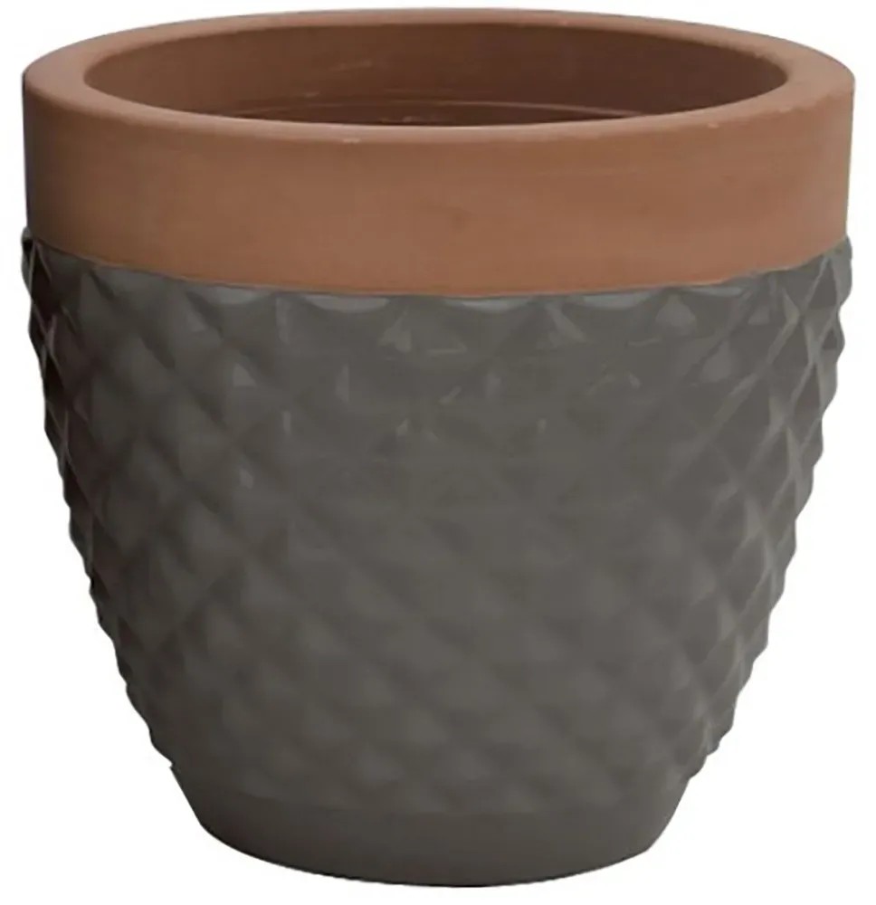 Obal na květináč Diamond kulatý, keramický, šedohnědý se vyznačuje moderním vzorem. Směs keramiky a hlíny je robustní a vhodná pro vnitřní i venkovní použití. K dostání v 5 různých velikostech a 3 moderních barvách.