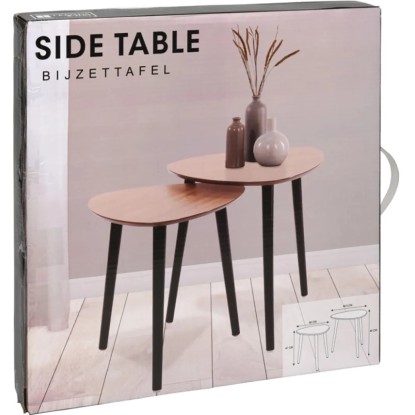 2dílná sada malého odkládacího stolku o průměru 40 cm a výšce 10 cm a velkého odkládacího stolku o průměru 45 cm a výšce 44,5 cm. Desky stolků jsou vyrobeny z kvalitní MDF desky potaženy dekorační vrstvou a stojí na 3 robustních nohách z borového dřeva potaženého černým PVC povlakem. Nohy jsou opatřeny polypropylenovými podložkami, které zajištují stabilitu a chrání vaše podlahy. Nohy jsou připevněny bezpečně k desce stolu pomocí kovových prvků.