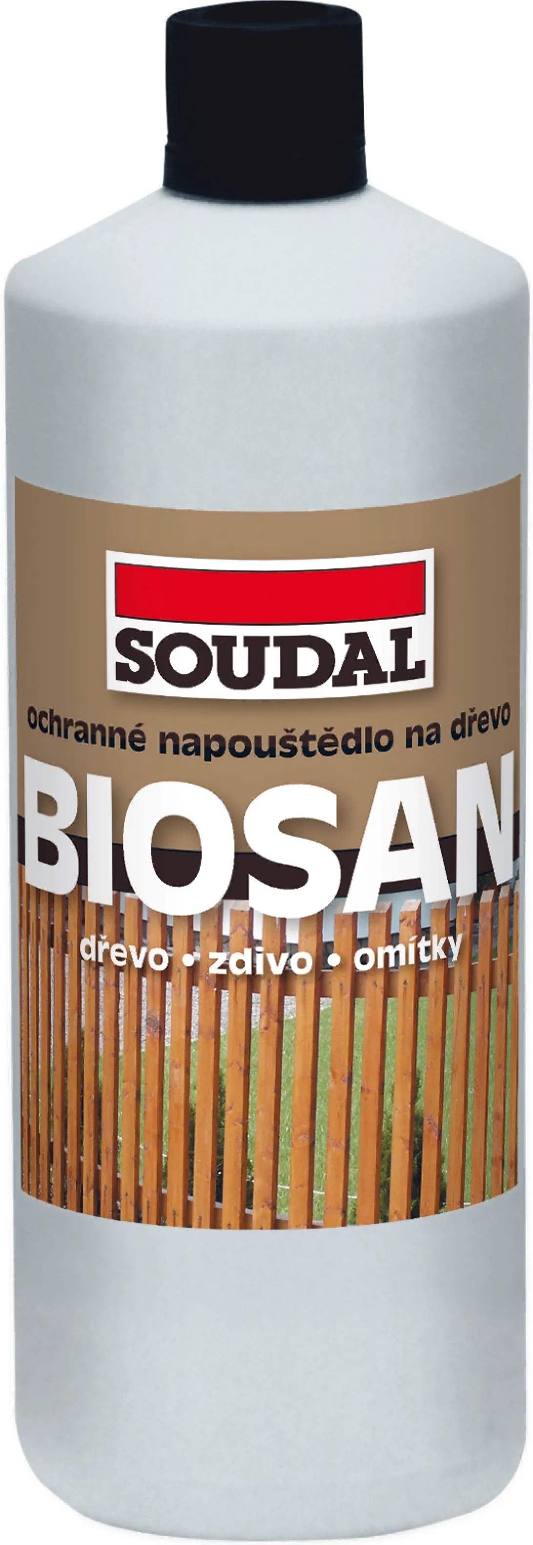 Soudal ochranné napouštědlo na dřevo biosan - kapalný vysoce účinný koncentrovaný prostředek pro dlouhodobou ochranu dřeva proti houbám, plísním a dřevokaznému hmyzu včetně dřevomorky domácí. Příklady použití: dřevěné povrchy v interiérech, ochrana krovů a trámů, preventivní ochrana dveří, obkladů a podlah, dřevěné povrchy v exteriérech, nátěry dřevěných konstrukcí jako pergoly, přístřešky, zahradní domky a kůlny, obložení balkónů a fasád, zahradní nábytek, okna, dveře apod.