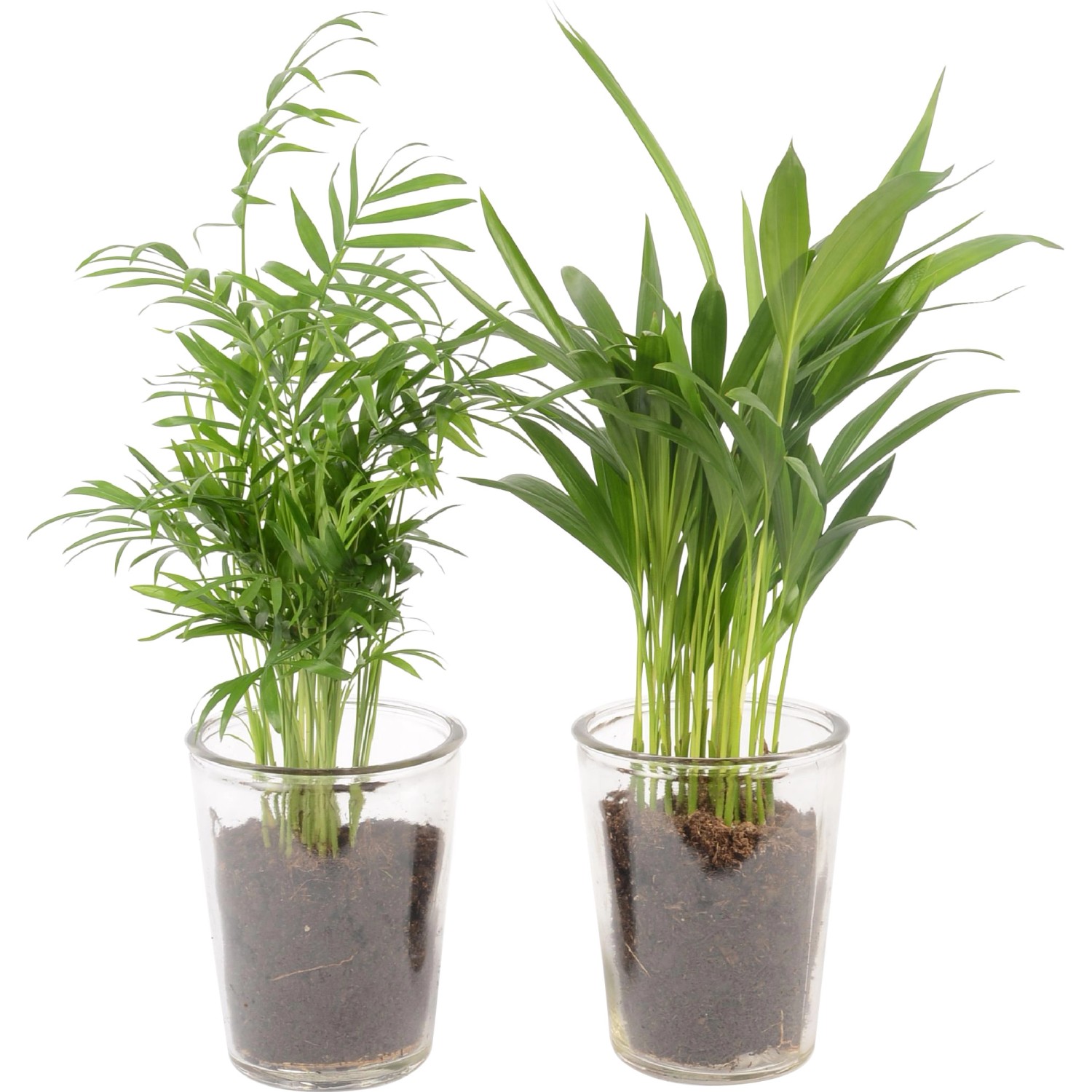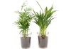 Toto aranžmá se dvěma různými palmami ve sklenicích s rovnými liniemi je moderní a pěkné. Areka, zlatoplodá palma (Areca Dypsis lutescens) je rostlinný druh pocházející z Madagaskaru, který zaujme svým elegantním habitem. Čistí vzduch a přispívá svými vlastnostmi k příjemnému klimatu v interiéru.