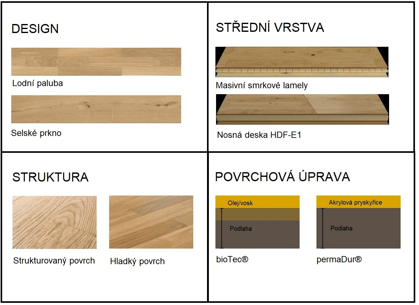 - Odolná povrchová úprava permaDur představuje odolné zapečetění. Vysoce kvalitní akrylové pryskyřice vytvrzené pod UV světlem vytvářejí na dřevě ochrannou vrstvu laku o tloušťce cca 40-50 mikrometrů, díky čemuž je povrch parket odolný vůči otěru, poškrábání a vzniku skvrn.