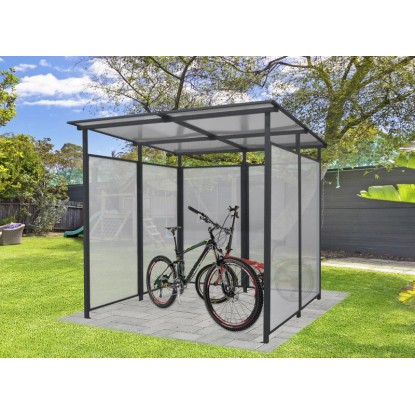 Multifunkční přístřešek má stabilní rám z hliníkových profilů a je zakrytý nárazuvzdornými komůrkovými deskami. Desky bočních stěn mají tloušťku 6 mm, střešní desky jsou 8 mm silné. Pro ochranu komůrkových desek jsou tyto navíc opatřeny UV ochrannou vrstvou.