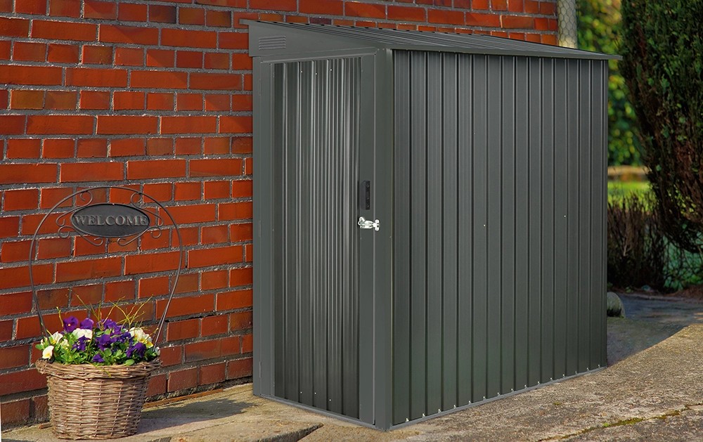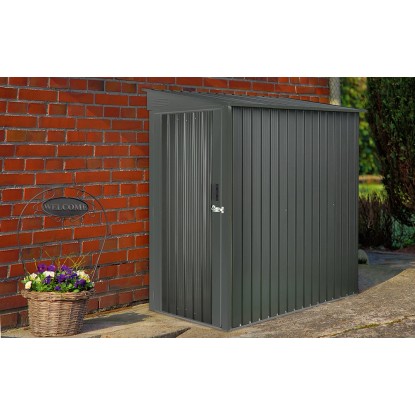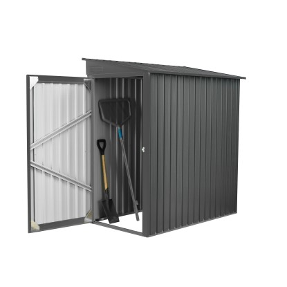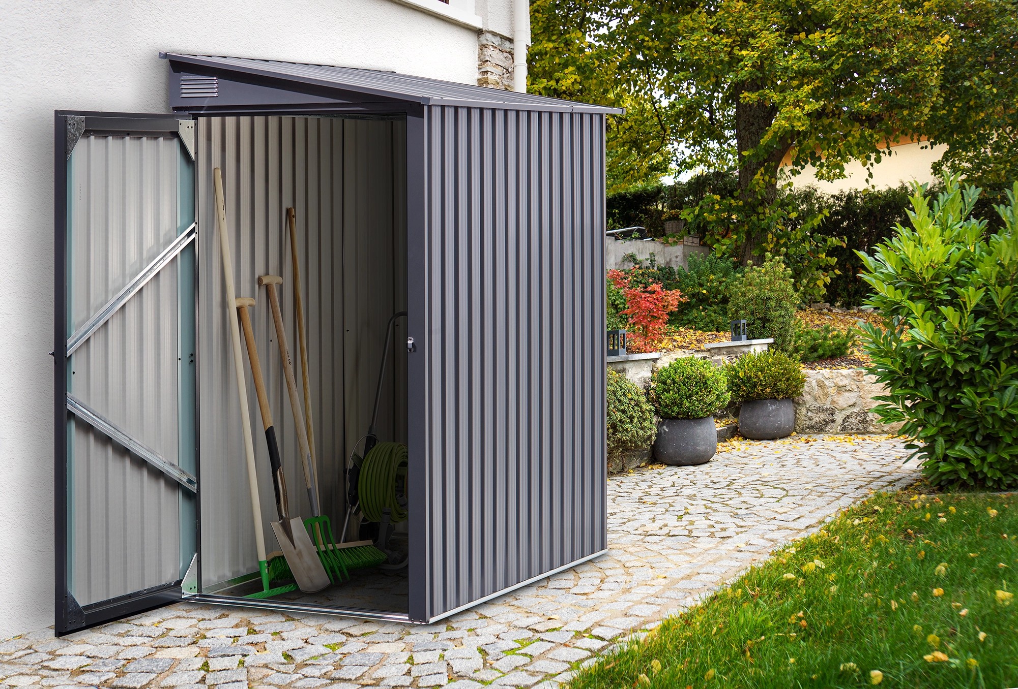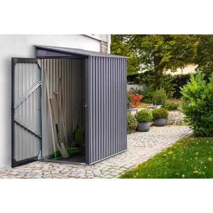 Prostorově úsporný domek na nářadí se skládá z pozinkovaného podlahového rámu a bočních stěn z profilovaného ocelového plechu. Kovový plech je lakován v antracitové barvě pro zvýšenou odolnost vůči povětrnostním vlivům a korozi. Ve štítu na přední a zadní straně se nachází větrací mřížka, která zajišťuje optimální cirkulaci vzduchu uvnitř. Tím se snižuje tvorba vlhkosti a nepříjemných pachů. Jednokřídlé dveře jsou vybaveny jak plastovým madlem, tak i dveřní zástrčkou a lze je v případě potřeby uzamknout (visací zámek není součástí dodávky).