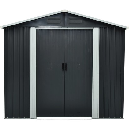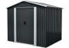 Domek na nářadí Dresden II v nadčasovém vzhledu je k dostání ve čtyřech velikostech. Střešní štíty propůjčují přístřešku charakter skutečného domu. Pozinkovaný ocelový plech je opatřen polyesterovým lakem v odstínu břidlice. Díky tomu nejen krásně zapadne do každé zahrady, ale také je spolehlivě chráněn proti korozi a poškrábání. Jemné žebrování zajišťuje vysokou pevnost plechové stěny. Větrací otvory jsou do ocelového plechu vyraženy. Domek je vybaven dvojitými posuvnými dveřmi, které je možné snadno otevřít i v zimě a poskytují dostatečný prostor pro průchod. Do předvrtaných otvorů v klice lze zavěsit visací zámek.