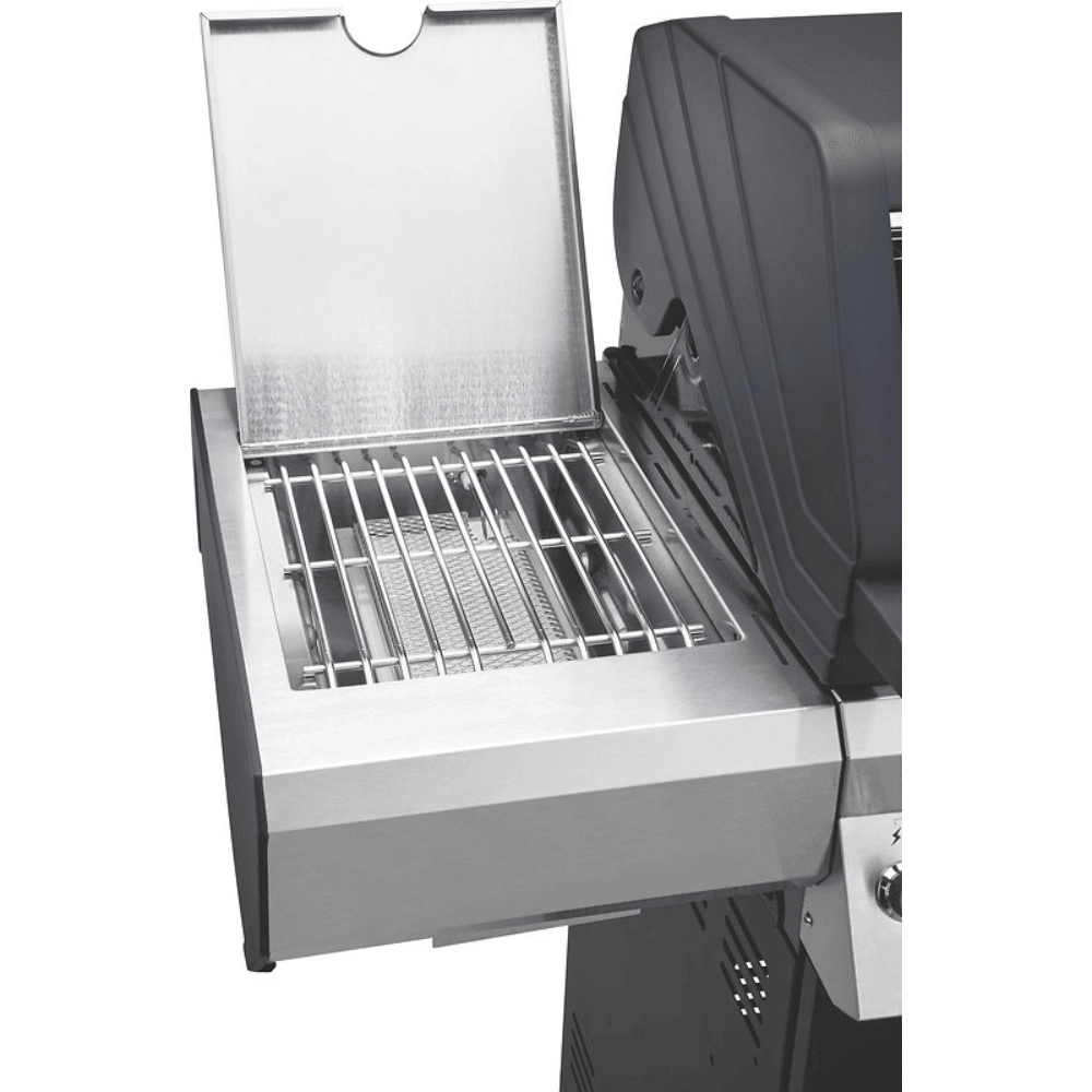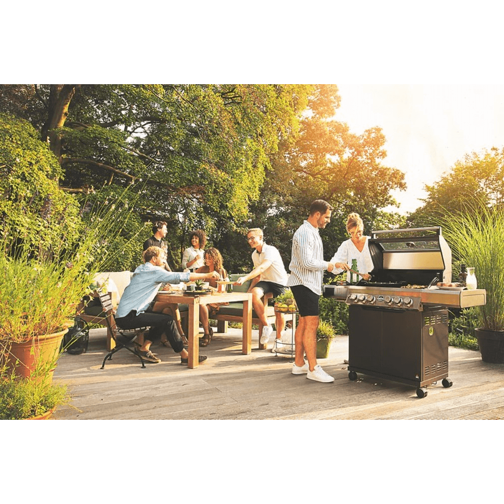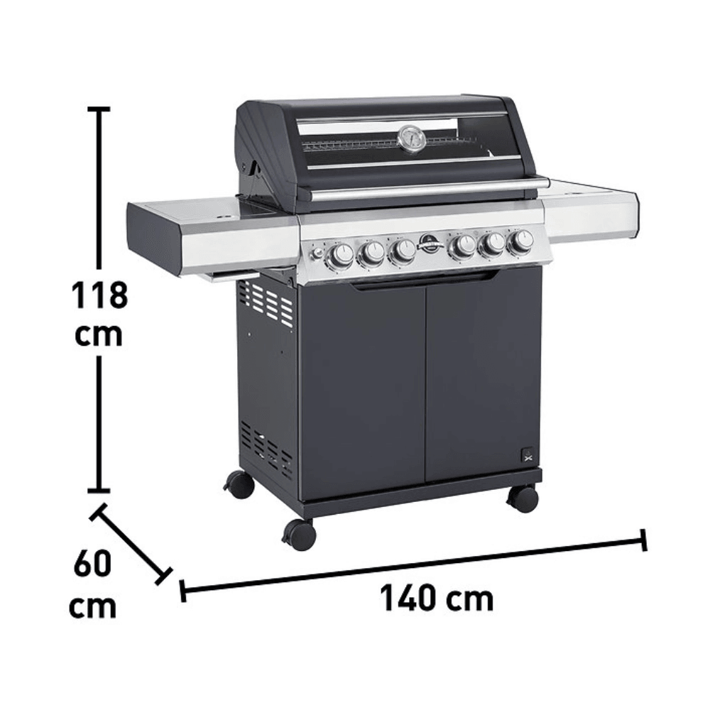 Na integrovaném bočním hořáku můžete během grilování připravovat lahodné přílohy nebo ohřívat omáčky. Integrovaný infračervený hořák Devil's Burner je to pravé pro opékání steaků. Dosahuje teploty až 800 °C, což znamená, že steaky jsou zvenčí křupavé a uvnitř zůstávají šťavnaté. Díky praktickým kolečkům snadno a rychle převezete plynový gril na požadované grilovací místo. Do prostorné spodní skříňky lze uložit plynové láhve. Další zajímavostí je 6 podsvícených ovládacích hlav.