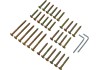 34dílná montážní sada slouží ke spolehlivé montáži sestavy s pohovkou Alfenas. Spolehlivě spojuje sedací plochy a konstrukce zahradního nábytku i konferenčního stolku. Upevňovací sada zahrnuje všechny potřebné šrouby v různých délkách a typech. Je vyrobena z nerezové oceli a hodí se k odstínu dřeva nábytku mosazného zbarvení. Pro montáž bez použití nářadí jsou přiloženy vhodné inbusové klíče.