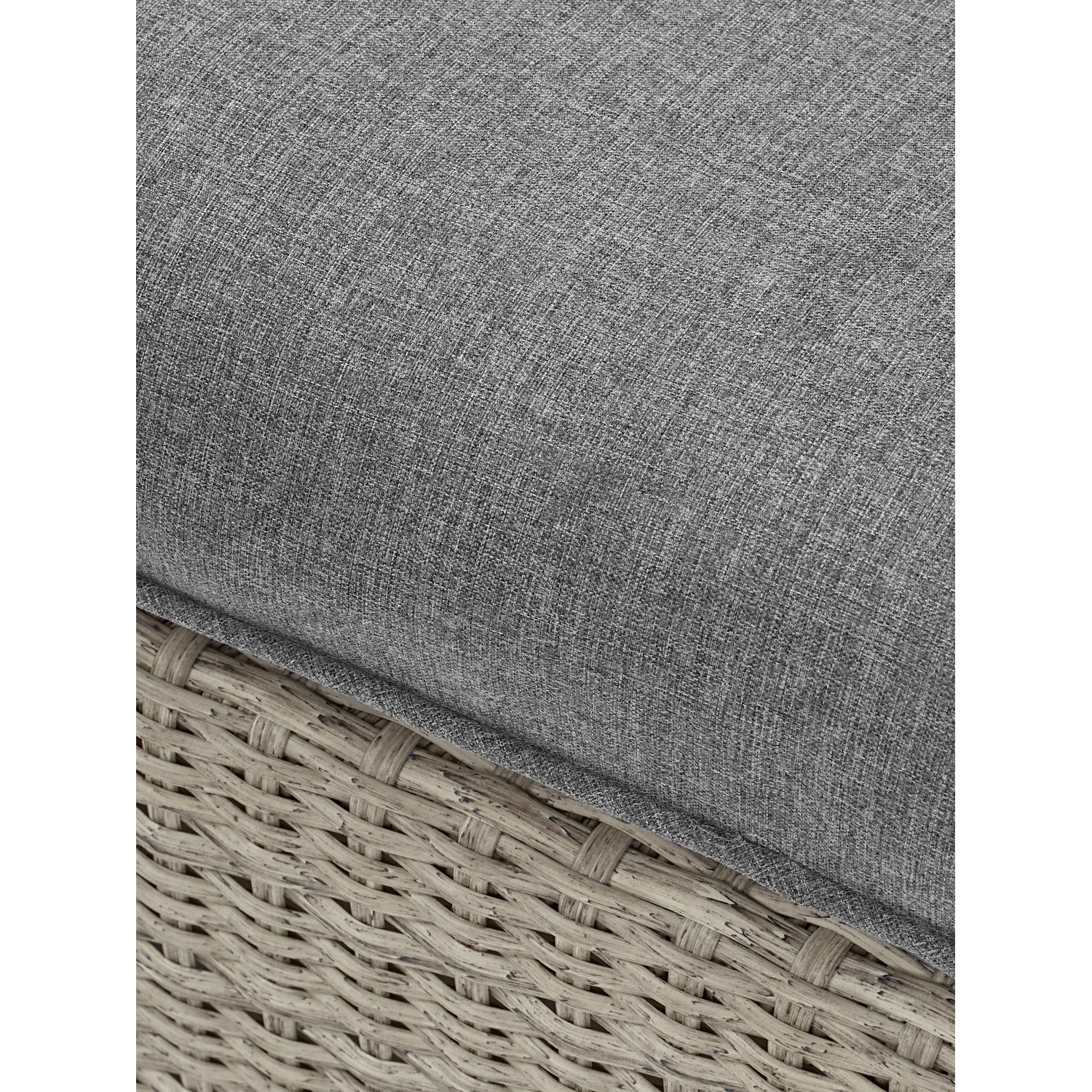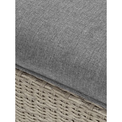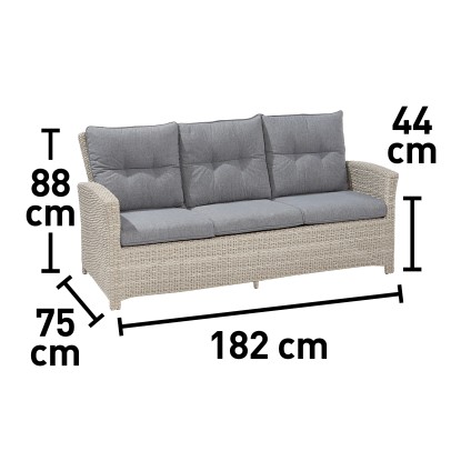 Díky velmi stabilní, ale přesto lehké hliníkové konstrukci, která váží pouhých 20 kg, můžete pohovku snadno umístit na požadované místo ve vaší zahradě. Ručně vyplétaný polyratan v barvě Cloud přesvědčí svou odolností vůči povětrnostním vlivům. Součástí dodávky jsou pohodlné polštáře v barvě Fossil. Výplň sedacích polstrů je z 10 cm vysoké pěnové hmoty a zádový polstr je vyroben z tkaného polyesteru. Trojmístná pohovka má rozměry 88 cm x 182 cm x 75 cm, a díky tomu poskytuje dostatek místa pro tři osoby.