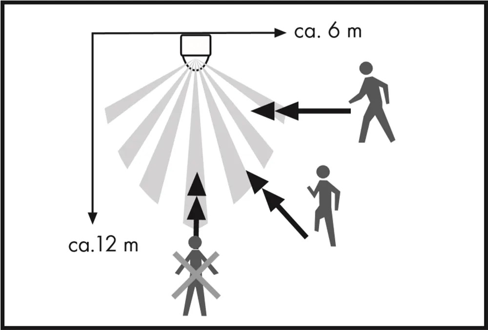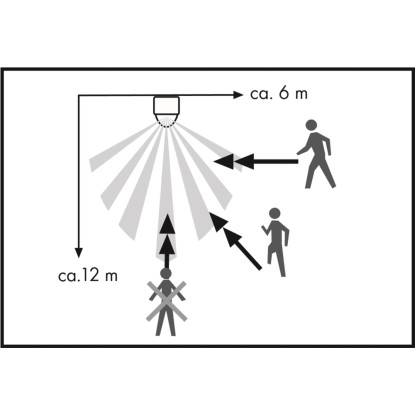 Bezpečná infračervená technologie reaguje na teplené záření z pohybujících se objektů, které vstupují do detekčního dosahu senzoru, a to jak z lidí, tak i zvířat. Detekční oblast má velikost 180°s dosahem cca 12 m a je vertikálně nastavitelná, aby se v případě potřeby zabránilo detekci např. zvířat. Dobu přepnutí lze nastavit od 10 sekund do 7 minut. Zda se detektor přepíná během dne nebo v noci, lze ovládat nastavením jasu od světla po tmu. Součástí dodávky je montážní materiál pro rychlou a snadnou instalaci na stěny a stropy.