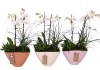 Bílá orchidej motýlokvětá se dvěma výhony a různé zelené rostliny jsou stylově zkombinovány do svěžího aranžmá. Oválné pastelové keramické nádoby jsou k dostání ve třech barvách. Kompozici doplňuje roztomilý malý přívěsek. Pro toto aranžmá je ideální slunné místo a mírná zálivka. Je nutno vyloučit přímé polední slunce.