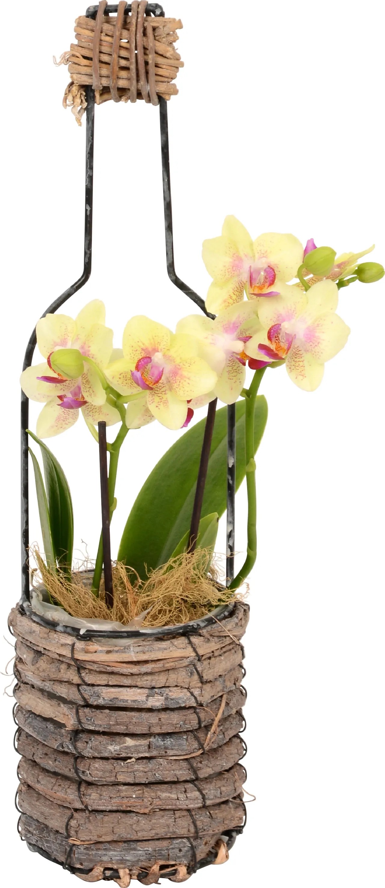 Aranžmá s orchidejí v dřevěné nádobě pr. cca 10 cm