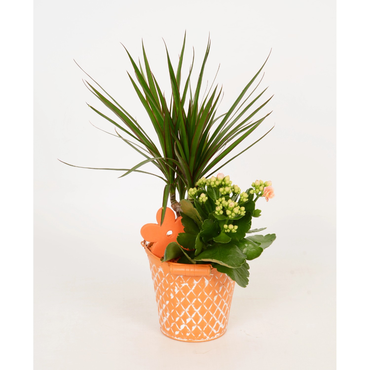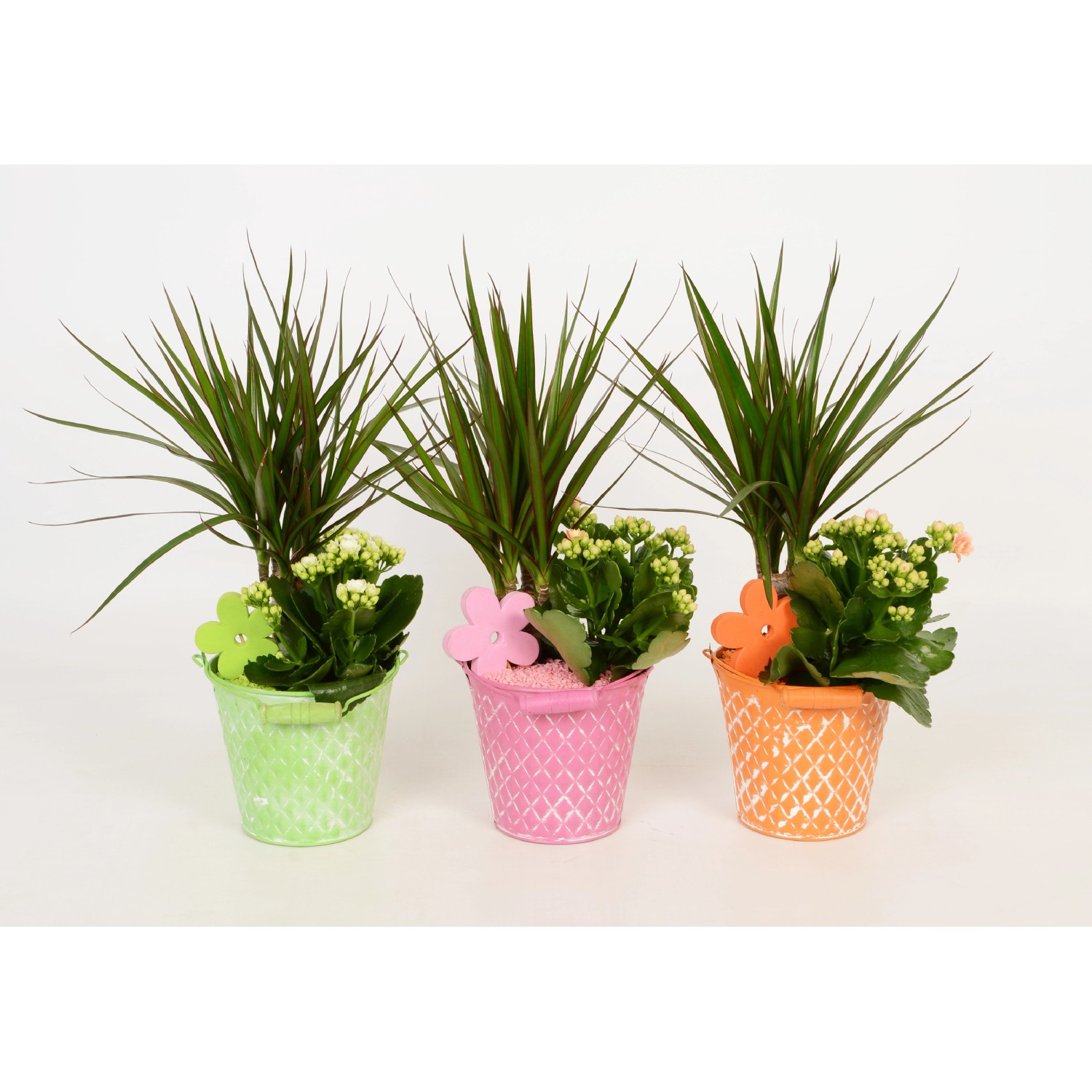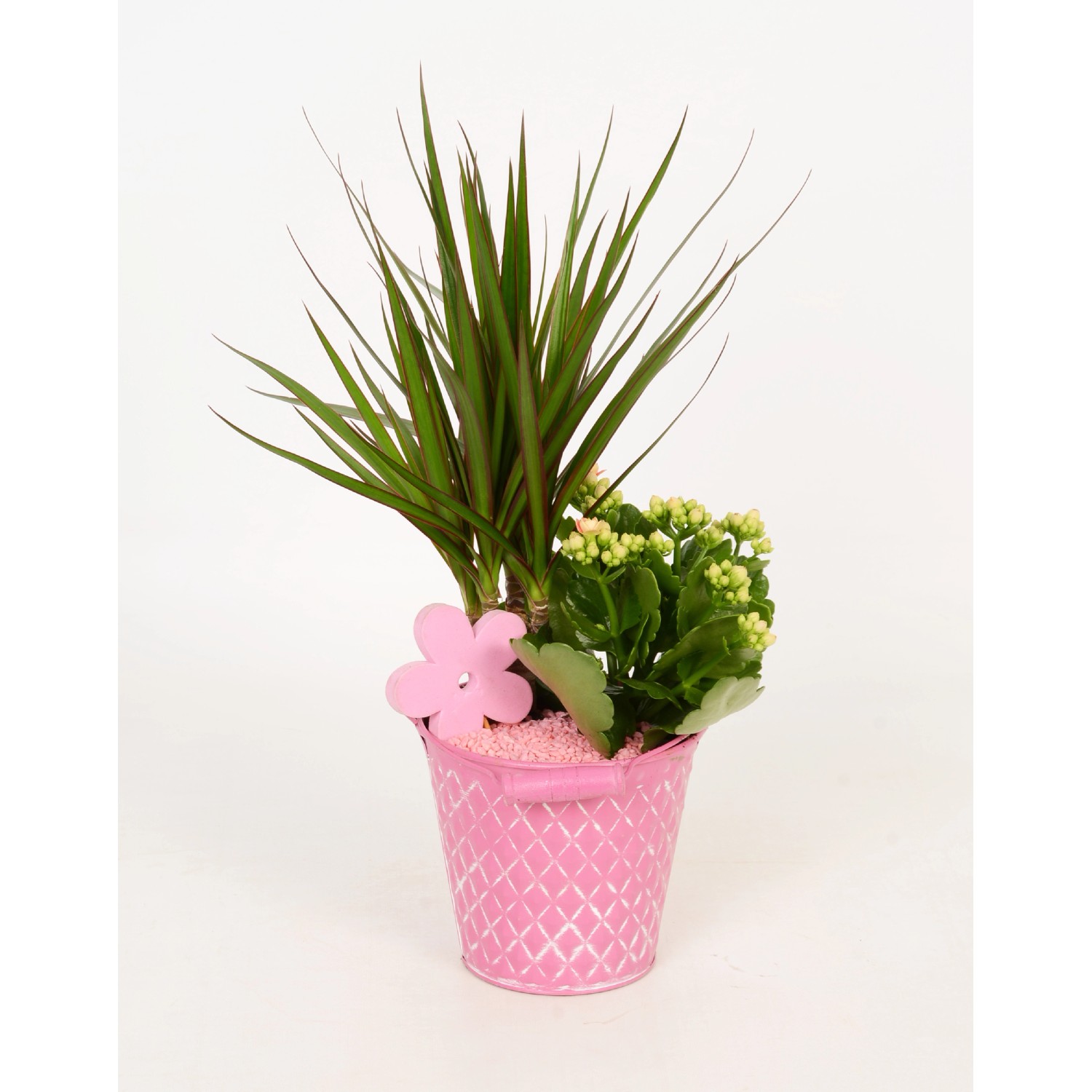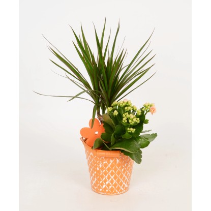 Toto barevné aranžmá v zinkovém kbelíku je tvořeno dekorativní dracénou (Dracaena marginata) a kolopejkou (Kalanchoe), které společně působí velmi harmonicky. Barvy květů kolopejky, granulátu a zinkového kbelíků jsou navzájem sladěné, čímž se dosáhne působivého dojmu. Rostliny preferují pokojovou teplotu a světlé stanoviště. Při pravidelné zálivce poskytují dlouhodobé potěšení. Během kvetení přihnojujte jednou měsíčně.