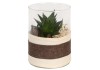 Toto moderní aranžmá z rostlin ve válcové váze ze skla je osazeno haworthií. Ozdobeno mechem, dřevěnou štěpkou a moderní látkou. Tuto látku můžete snadno odstranit, takže budete moci vázu používat celý rok. Toto podzimní aranžmá by mělo stát na světlém stanovišti, bez přímého slunečního světla. Zalévejte mírně. Ideální jako dárek.