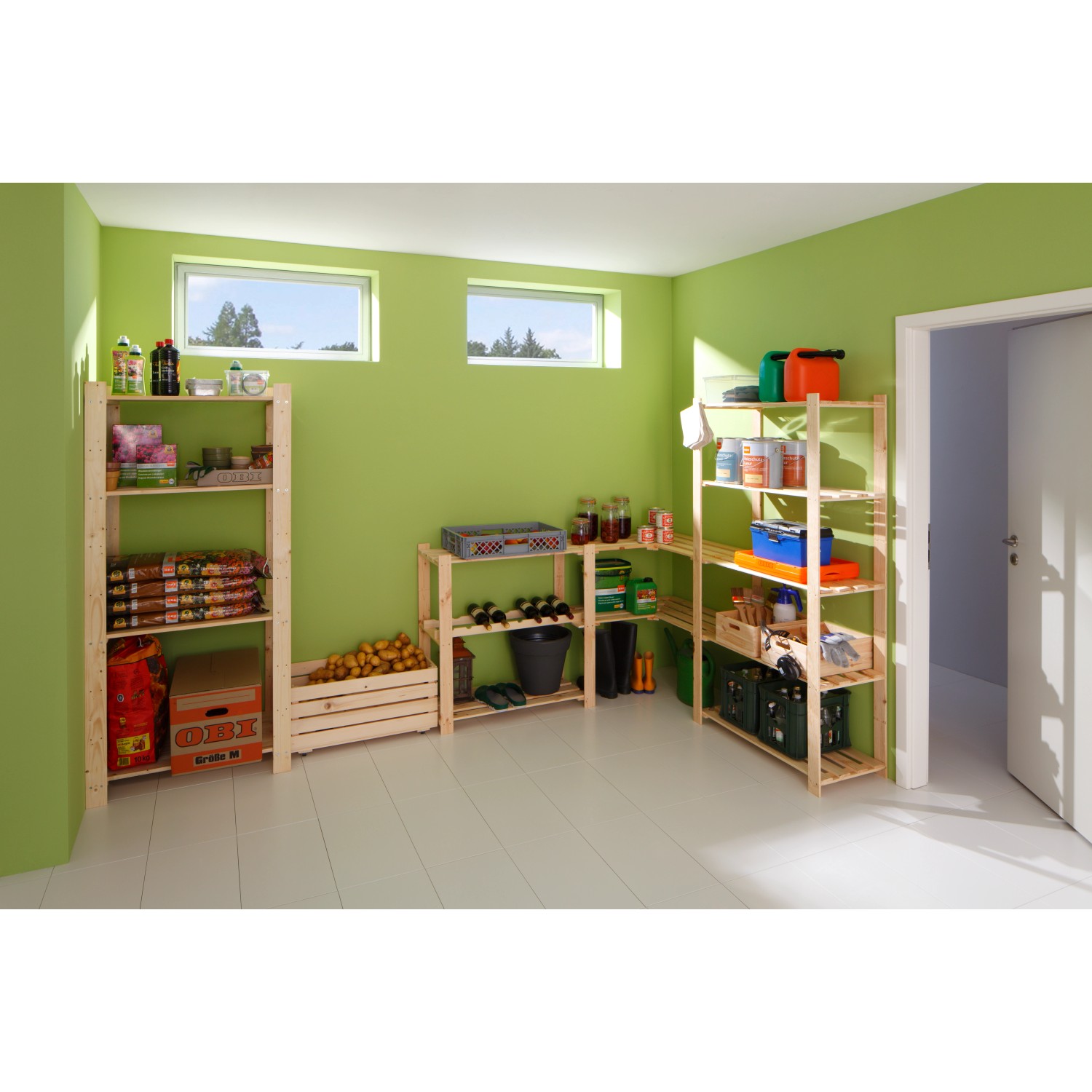 OBI dřevěná rohová regálová police je vyrobena z jehličnatého dřeva certifikovaného FSC. Police se skládá ze dvou částí, které se do sebe zasunou a jednoduše vloží do regálu. Nosnost police je 25 kg (při rovnoměrném rozložení zatížení).
