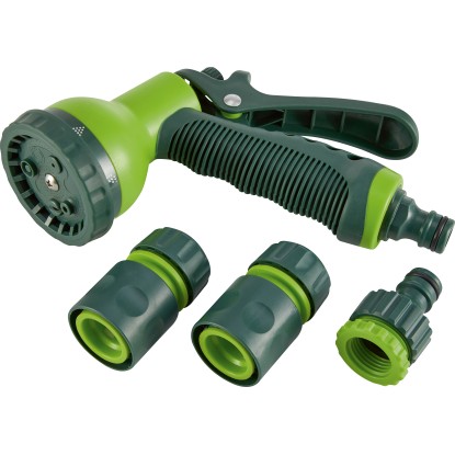 4dílná sada multifunkční sprchy je skutečný všestranný pomocník a hodí se k plošnému zavlažování zahrady, šetrnému postřikování a také čištění zahradních dlaždic. Druh rozstřiku a intenzitu proudu vody lze jednoduše regulovat rukou. Multifunkční sprcha je vybavena čtyřmi funkcemi vodního paprsku, které lze individuálně zvolit. Lze nastavit ostrý proud vody a také jemnou mlhu. Sprcha je vyrobena z plastu ze stabilního plastu s dlouhou životností. Ergonomická a pohodlná rukojeť zaručuje příjemnou manipulaci. Sada multifunkční sprchy je kompatibilní se všemi běžnými hadicovými přípojkami. Vedle sprchy jsou součástí dodávky také dvě hadicové spojky a kohoutkový adaptér.