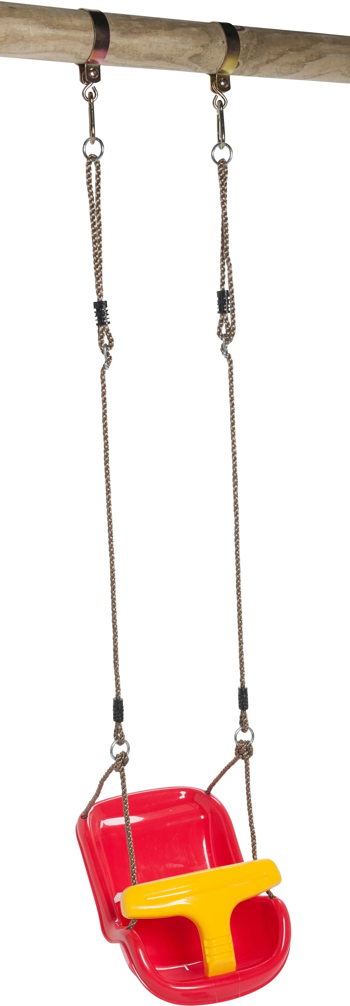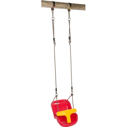 Houpačka pro malé děti Deluxe z červeno-žlutého plastu je výškově nastavitelná. Jednoduchá montáž pomocí 2 houpačkových háků (nejsou součástí dodávky). Pouze pro děti do 3 let.