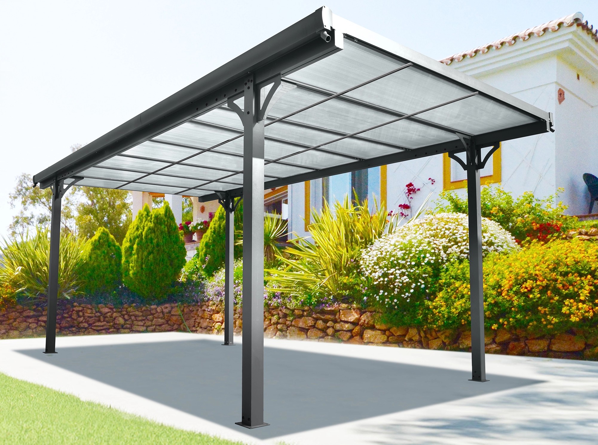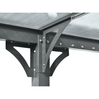 Střechu přístřešku pro auto tvoří polykarbonátové panely o síle 8 mm, které jsou odolné vůči povětrnostním vlivům a UV záření, díky čemuž barva střechy zůstane stejná a nevybledne. Střecha odolává zatížení sněhem až do 100 kg/m2.