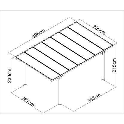 Základní plocha přístřešku pro auto je 14,88 m2 a díky rozměrům vjezdu 215 x 260 cm poskytuje dostatek prostoru i pro SUV. Rozměry včetně přesahu střechy: 300 x 496 cm.