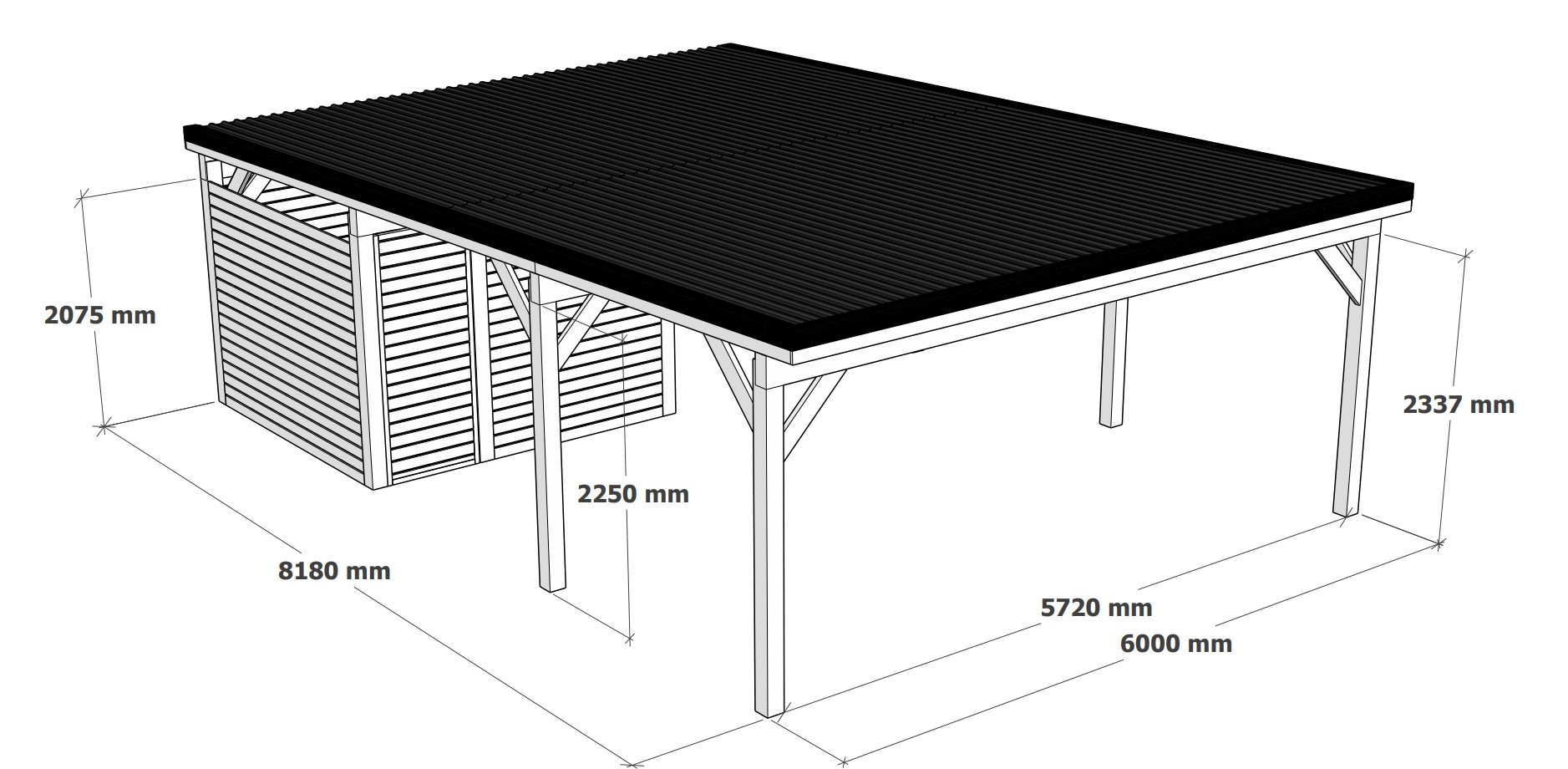 Domek na nářadí, který je součástí přístřešku se skládá z hoblovaných prken 2,1 x 9,5 cm se vzdáleností mezi prkny 1,5 cm, tak aby bylo zachováno přirozené odvětrávání. Domek na nářadí vám poskytne dodatečné místo pro uložení všech vašich potřeb tak, abyste je měli vždy po ruce.
