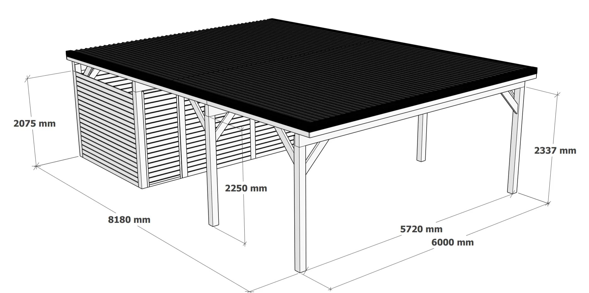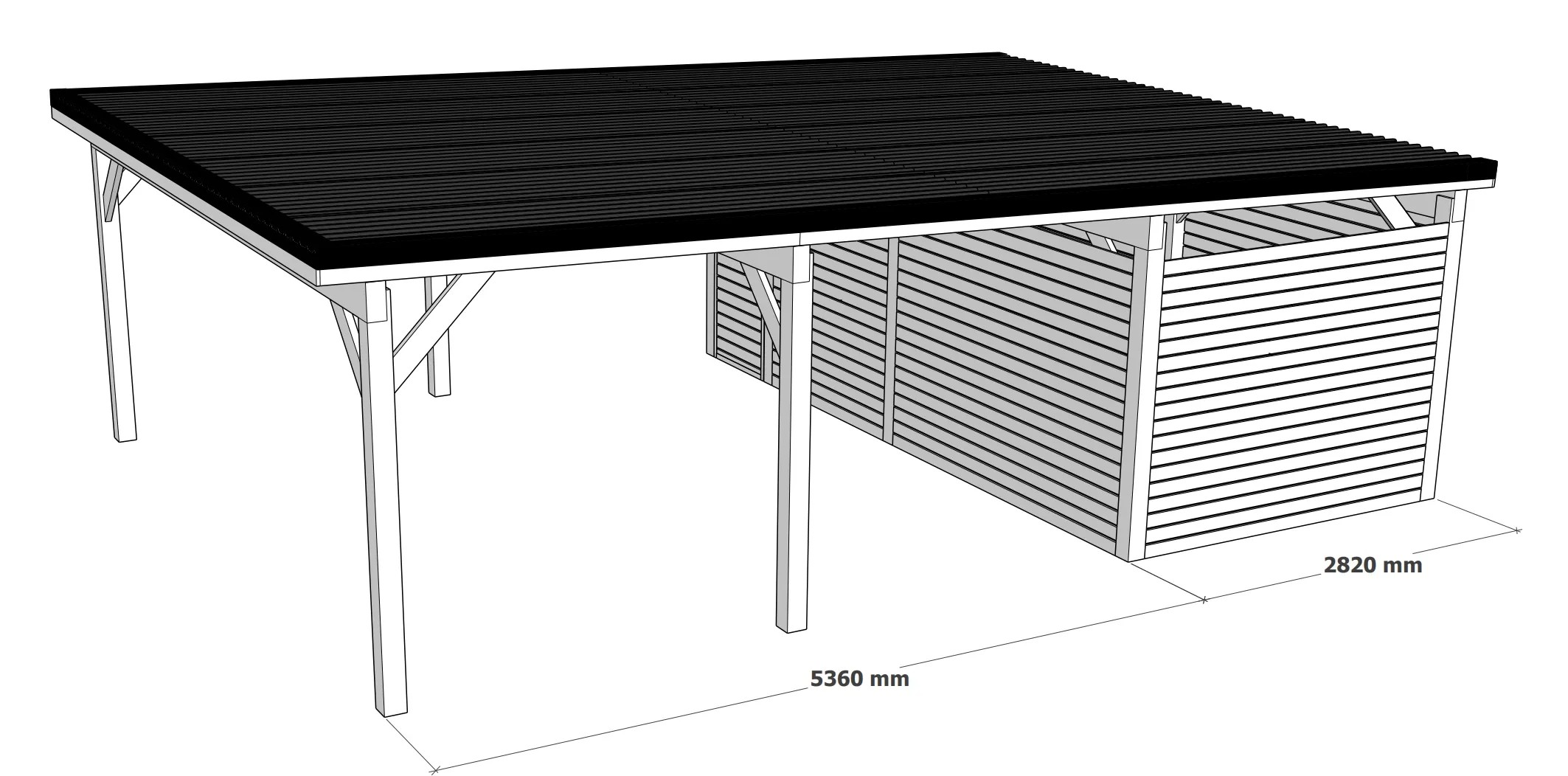 Domek na nářadí, který je součástí přístřešku se skládá z hoblovaných prken 2,1 x 9,5 cm se vzdáleností mezi prkny 1,5 cm, tak aby bylo zachováno přirozené odvětrávání. Domek na nářadí vám poskytne dodatečné místo pro uložení všech vašich potřeb tak, abyste je měli vždy po ruce.