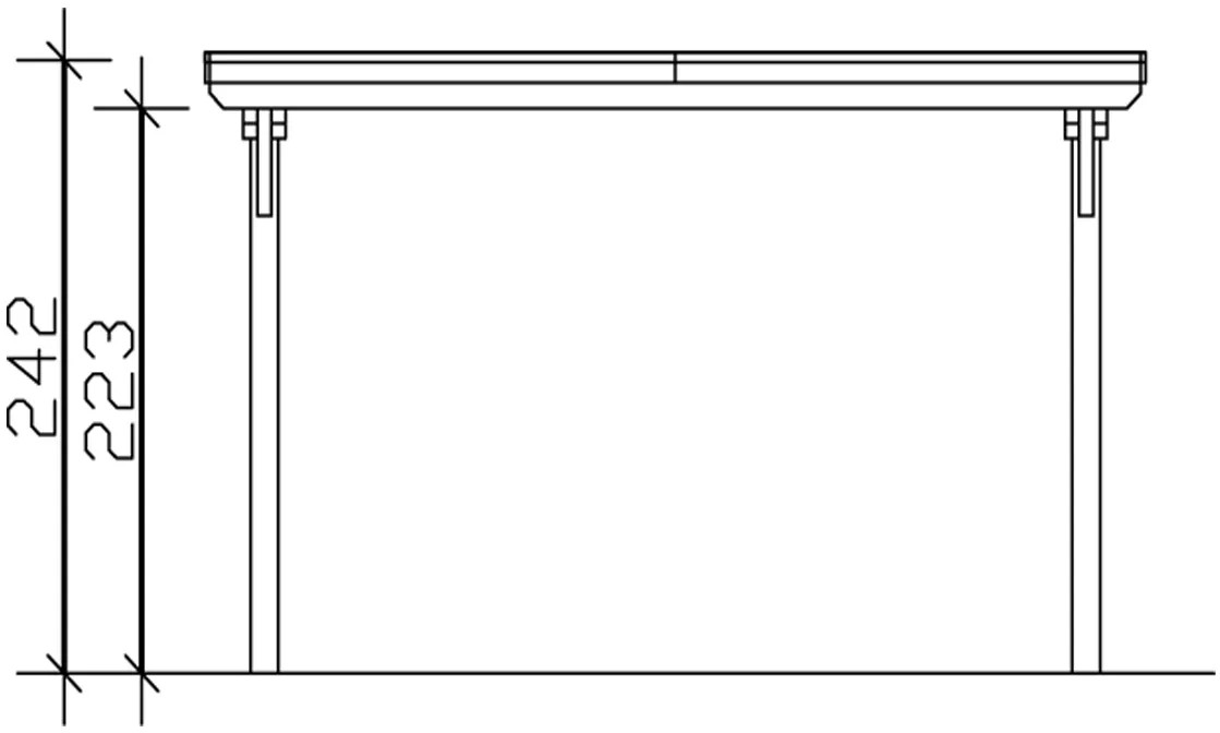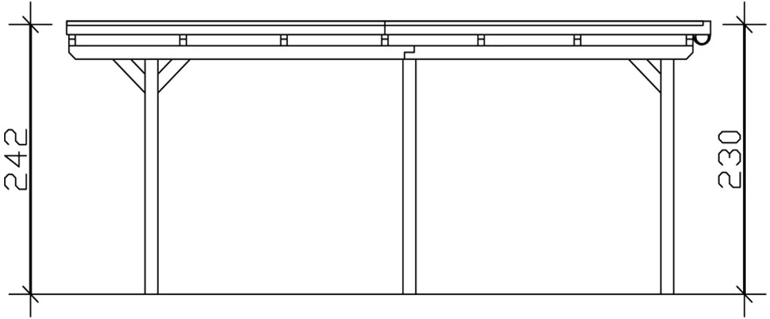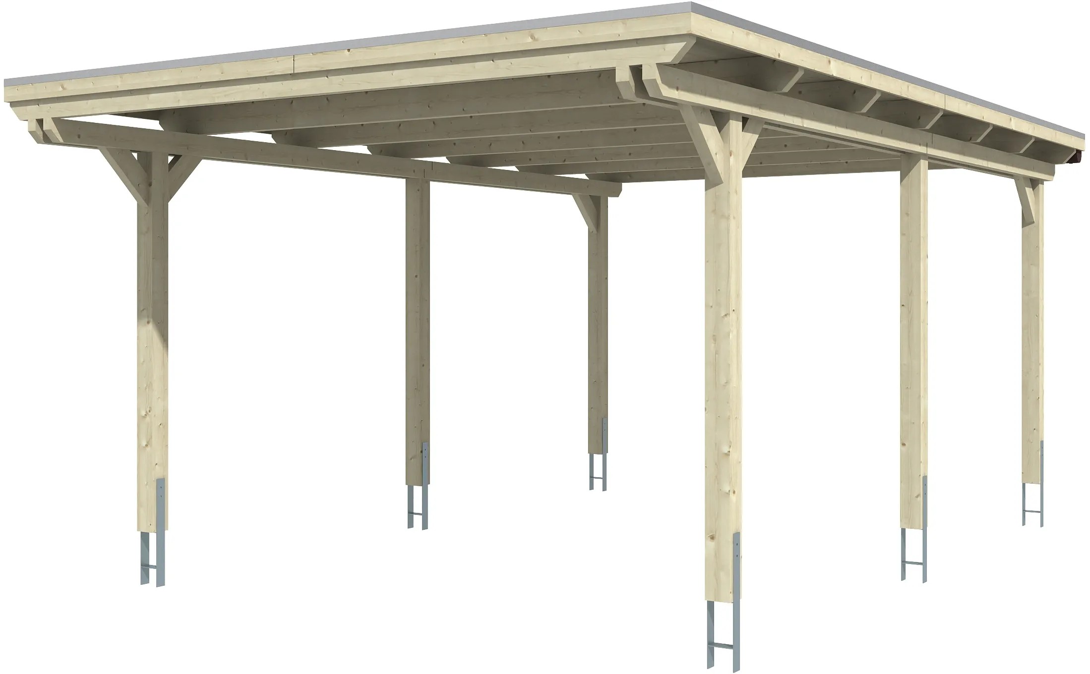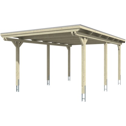 Přístřešky Skan Holz Emsland poskytují vysoce kvalitní ochranu proti povětrnostním vlivům a jsou vyrobeny ze spárovky (smrkových lepených trámů). Přístřešky s plochou střechou Emsland mají 12 x 12 cm silné sloupky včetně kotevních patek ve tvaru H k zabetonování. Střešní krytina je z 19 mm silného střešního obložení s fólií EPDM. Zakončení střechy tvoří dřevěná lišta s hliníkovou zakončovací hranou. Součástí dodávky je plastový okapový žlab s okapovým svodem, montážní materiál a návod.