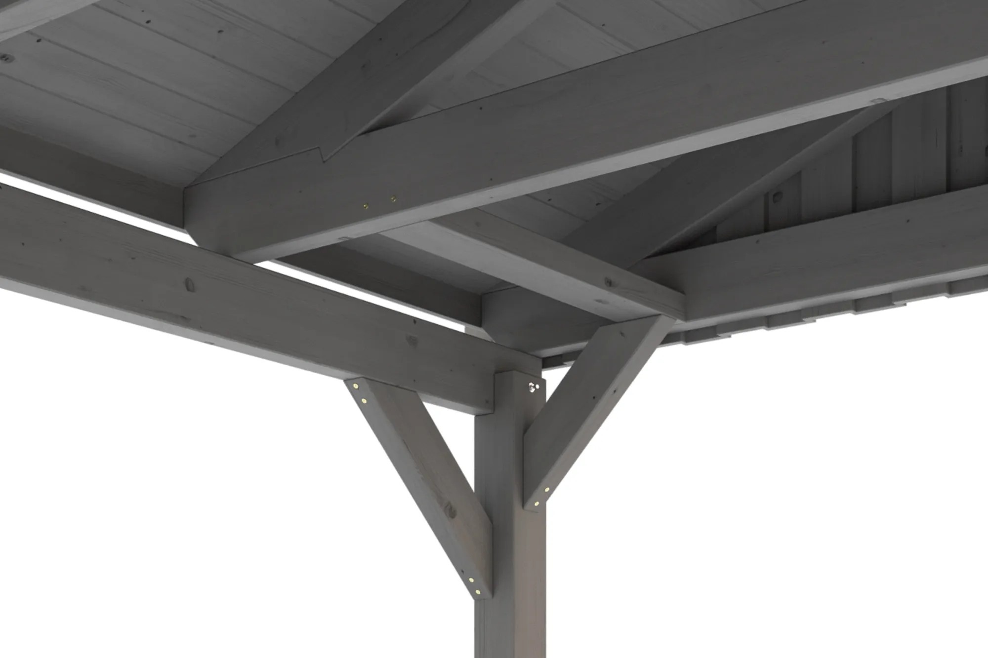 Střecha přístřešku je dodávána s 19 mm střešním bedněním z masivního dřeva k zakrytí střešními šindelemi (součástí dodávky) nebo taškami (nejsou součástí dodávky). Sloupky přístřešku jsou velice odolné o rozměru 12 x 12 x 220 cm a dodávány včetně hmoždinek. H-kotvy 60 cm z pozinkované oceli učené pro zabetonování do vlastního bodového základu jsou součástí dodávky včetně montážního materiálu a návodu. Kotvy pevně spojují sloupky s podkladem a zajišťují vysokou stabilitu.