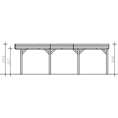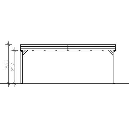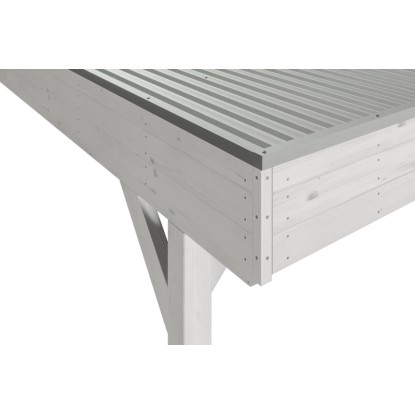 Přístřešky na auto Skan Holz Grunewald jsou vyrobeny z vysušeného smrkového dřeva lepeného v několika vrstvách. Tato směs je odolnější proti povětrnostním vlivům a je méně náchylná k praskání než přirozené dřevo. Sloupky přístřešku o rozměru 12 x 12 x 220 cm jsou dodávány včetně ukotvení ve tvaru písmene H. 60 cm dlouhé H-kotvy jsou vyrobeny z pozinkované ploché oceli k zabetonování do vlastního bodového základu. Kotvy pevně spojují sloupky s podkladem a zaručují vysokou stabilitu. Plochá střecha přístřešku je k dispozici ve dvou variantách - z hliníkových panelů (horní strana antracitová, spodní strana světle šedá) s trapézovým profilem (ALU) nebo s 19 mm střešním bedněním s perodrážkou s dostatečným množstvím EPDM fólie. Střešní krytina z hliníkových panelů je nerozbitná a odolná proti kroupám, může být ale hlučná při dešti. Je vysoce stabilní a tvarově stálá i při vysokých povrchových teplotách. Střecha je dodávána s plastovými svody.