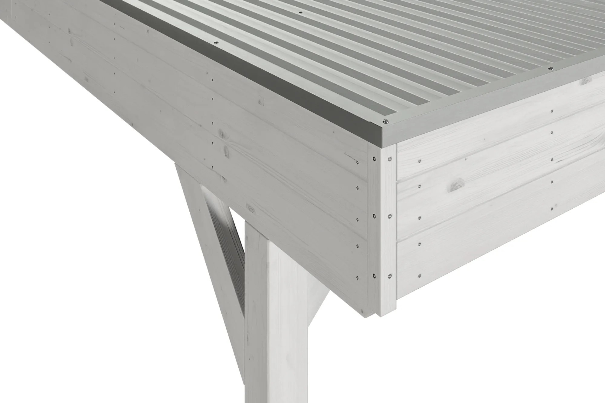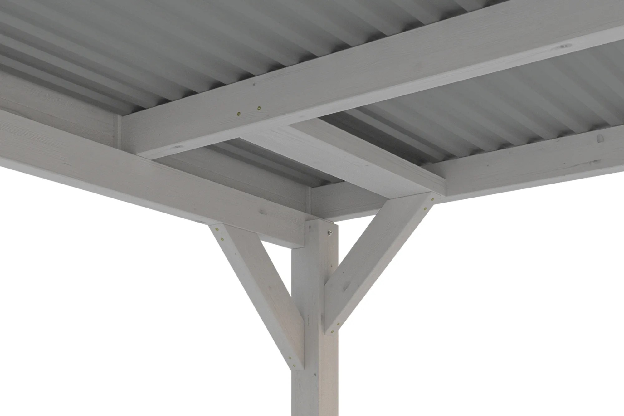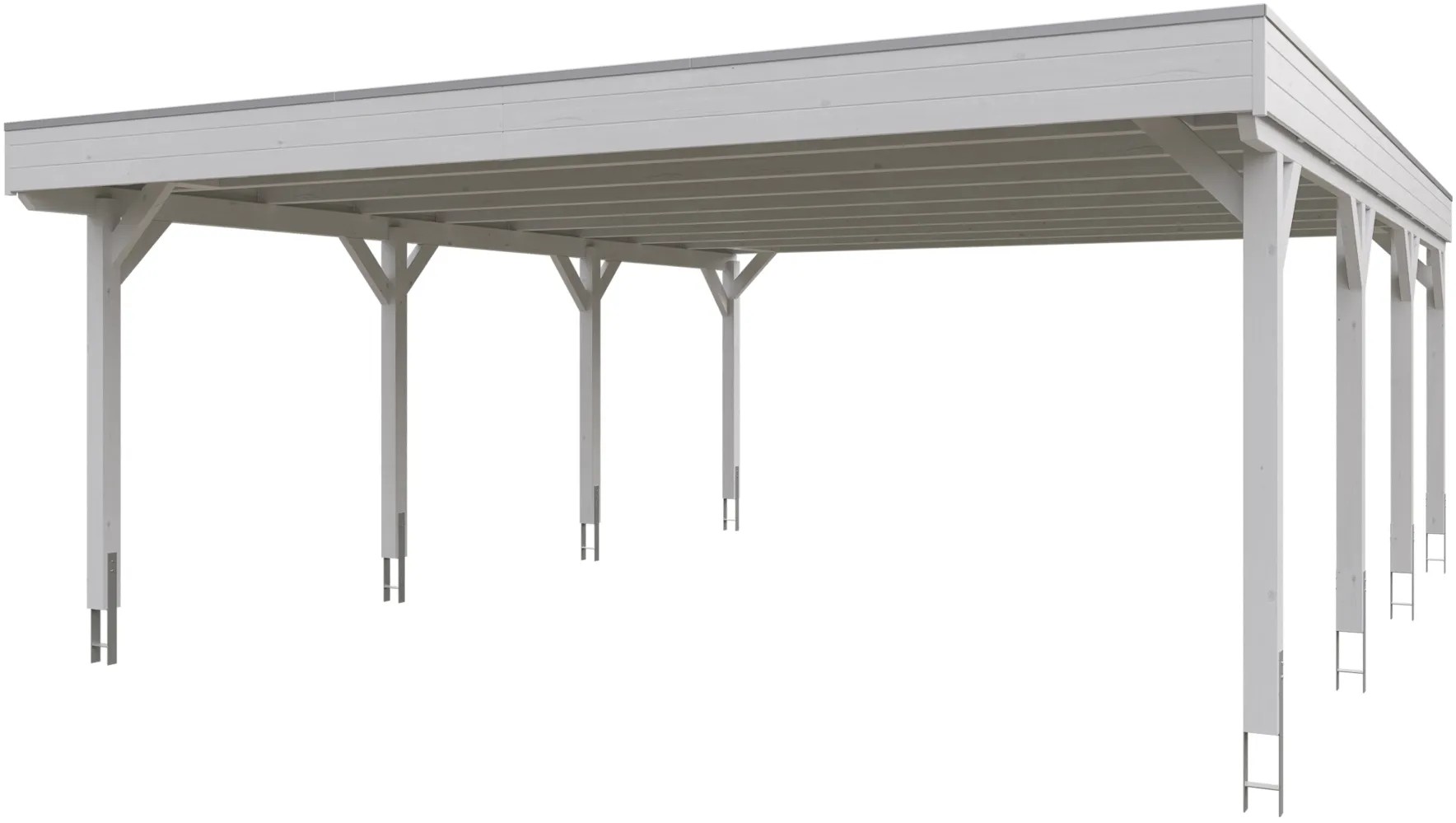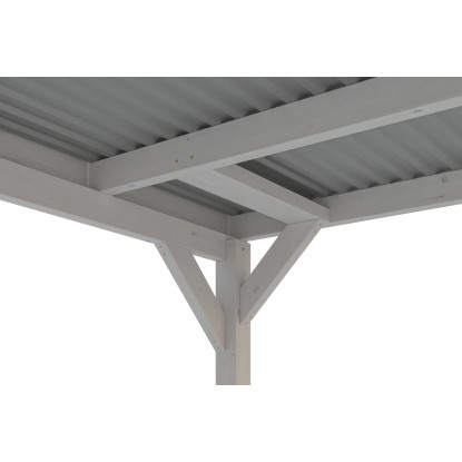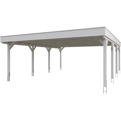 Přístřešek na auto Skan Holz Grunewald s plochou střechou je vyroben z vysušeného smrkového dřeva lepeného v několika vrstvách. Tato směs je odolnější proti povětrnostním vlivům a je méně náchylná k praskání než přirozené dřevo. Přístřešky Grunewald jsou k dispozici v různých velikostních a barevných variantách - přírodní (neošetřené), ořech, dub světlý, břidlicově šedý a bílý. V případě přírodního (neošetřeného) dřeva je bezpodmínečně nutný pravidelný ochranný nátěr proti napadení houbami a hmyzem. Před montáží je nutné použít ochranný nátěr ze všech stran proti napadení houbami a hmyzem, ochranu před zbarvením a poškozením UV zářením jako druhou vrstvu a jako finální nátěr kvalitní lazuru nebo barvu na dřevo. Barevné varianty nátěrů jsou již všemi potřebnými nátěry opatřeny.