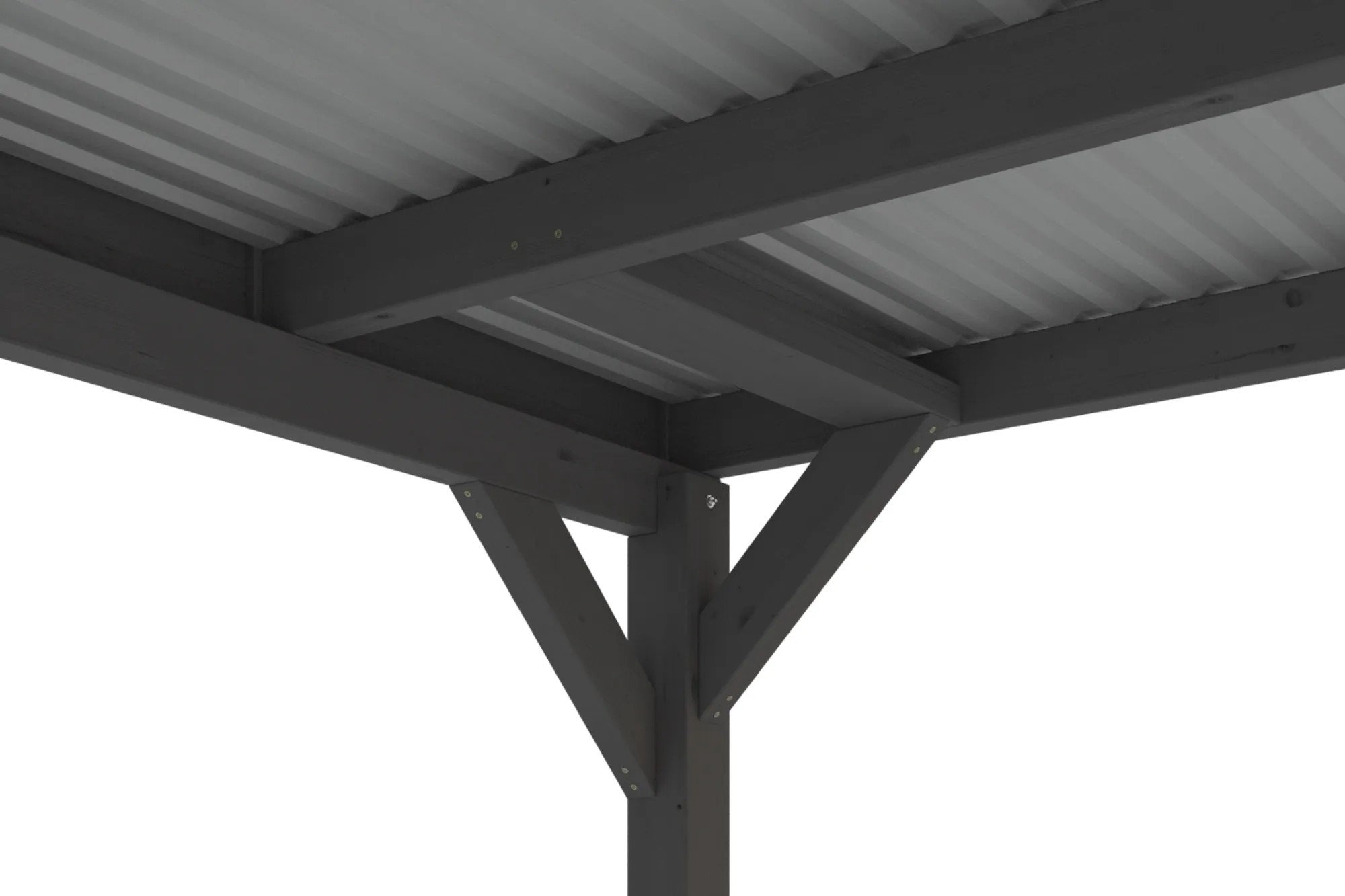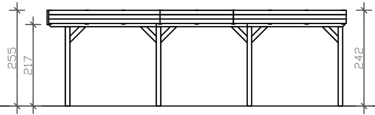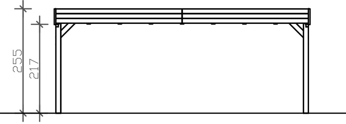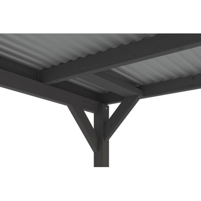 Přístřešky na auto Skan Holz Grunewald jsou vyrobeny z vysušeného smrkového dřeva lepeného v několika vrstvách. Tato směs je odolnější proti povětrnostním vlivům a je méně náchylná k praskání než přirozené dřevo. Sloupky přístřešku o rozměru 12 x 12 x 220 cm jsou dodávány včetně ukotvení ve tvaru písmene H. 60 cm dlouhé H-kotvy jsou vyrobeny z pozinkované ploché oceli k zabetonování do vlastního bodového základu. Kotvy pevně spojují sloupky s podkladem a zaručují vysokou stabilitu. Plochá střecha přístřešku je k dispozici ve dvou variantách - z hliníkových panelů (horní strana antracitová, spodní strana světle šedá) s trapézovým profilem (ALU) nebo s 19 mm střešním bedněním s perodrážkou s dostatečným množstvím EPDM fólie. Střešní krytina z hliníkových panelů je nerozbitná a odolná proti kroupám, může být ale hlučná při dešti. Je vysoce stabilní a tvarově stálá i při vysokých povrchových teplotách. Střecha je dodávána s plastovými svody.