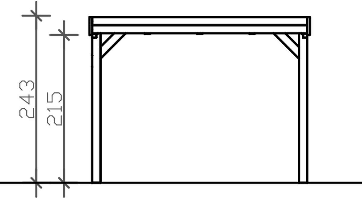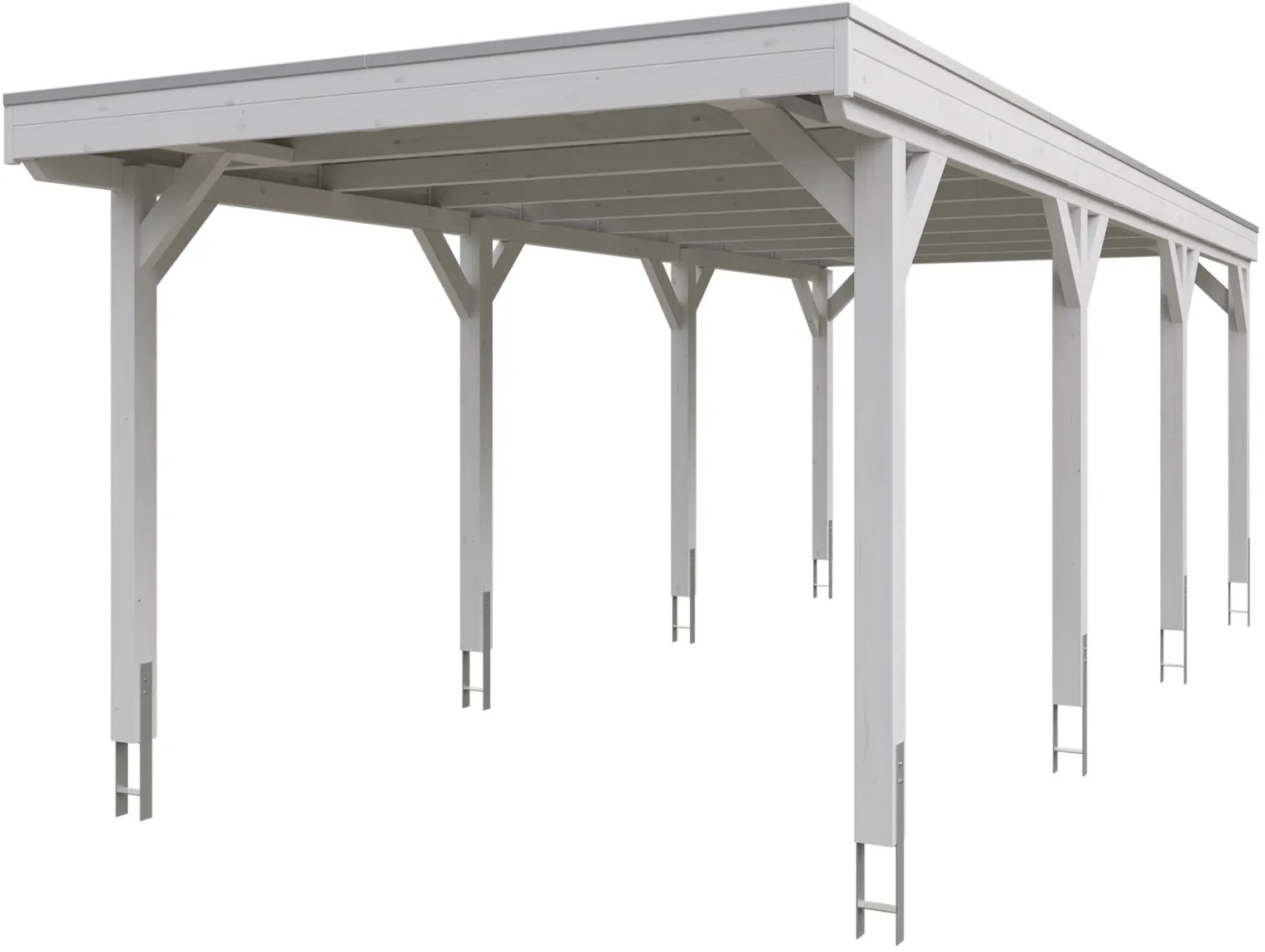 Přístřešky na auto Skan Holz Grunewald jsou vyrobeny z vysušeného smrkového dřeva lepeného v několika vrstvách. Tato směs je odolnější proti povětrnostním vlivům a je méně náchylná k praskání než přirozené dřevo. Sloupky přístřešku o rozměru 12 x 12 x 220 cm jsou dodávány včetně ukotvení ve tvaru písmene H. 60 cm dlouhé H-kotvy jsou vyrobeny z pozinkované ploché oceli k zabetonování do vlastního bodového základu. Kotvy pevně spojují sloupky s podkladem a zaručují vysokou stabilitu. Plochá střecha přístřešku je k dispozici ve dvou variantách - z hliníkových panelů (horní strana antracitová, spodní strana světle šedá) s trapézovým profilem (ALU) nebo s 19 mm střešním bedněním s perodrážkou s dostatečným množstvím EPDM fólie. Střešní krytina z hliníkových panelů je nerozbitná a odolná proti kroupám, může být ale hlučná při dešti. Je vysoce stabilní a tvarově stálá i při vysokých povrchových teplotách. Střecha je dodávána s plastovými svody.