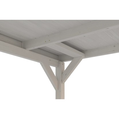 Přístřešek na auto Skan Holz Grunewald s plochou střechou je vyroben z vysušeného smrkového dřeva lepeného v několika vrstvách. Tato směs je odolnější proti povětrnostním vlivům a je méně náchylná k praskání než přirozené dřevo. Přístřešky Grunewald jsou k dispozici v různých velikostních a barevných variantách - přírodní (neošetřené), ořech, dub světlý, břidlicově šedý a bílý. V případě přírodního (neošetřeného) dřeva je bezpodmínečně nutný pravidelný ochranný nátěr proti napadení houbami a hmyzem. Před montáží je nutné použít ochranný nátěr ze všech stran proti napadení houbami a hmyzem, ochranu před zbarvením a poškozením UV zářením jako druhou vrstvu a jako finální nátěr kvalitní lazuru nebo barvu na dřevo. Barevné varianty nátěrů jsou již všemi potřebnými nátěry opatřeny.