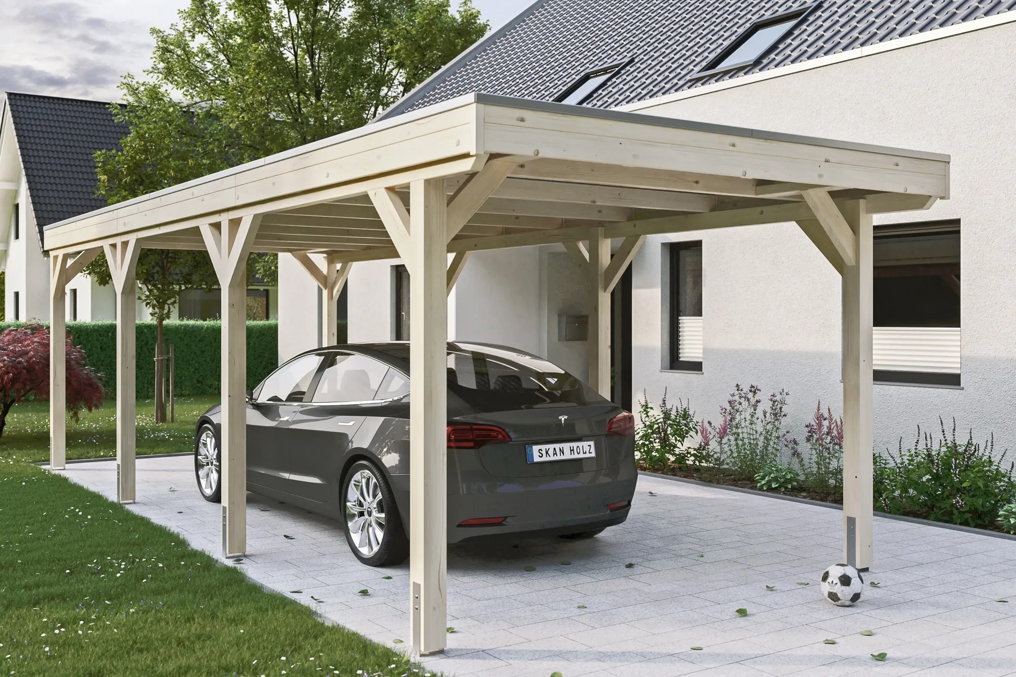Přístřešky na auto Skan Holz Grunewald jsou vyrobeny z vysušeného smrkového dřeva lepeného v několika vrstvách. Tato směs je odolnější proti povětrnostním vlivům a je méně náchylná k praskání než přirozené dřevo. Sloupky přístřešku o rozměru 12 x 12 x 220 cm jsou dodávány včetně ukotvení ve tvaru písmene H. 60 cm dlouhé H-kotvy jsou vyrobeny z pozinkované ploché oceli k zabetonování do vlastního bodového základu. Kotvy pevně spojují sloupky s podkladem a zaručují vysokou stabilitu. Plochá střecha přístřešku je k dispozici ve dvou variantách - z hliníkových panelů (horní strana antracitová, spodní strana světle šedá) s trapézovým profilem (ALU) nebo s 19 mm střešním bedněním s perodrážkou s dostatečným množstvím EPDM fólie. Střešní krytina z hliníkových panelů je nerozbitná a odolná proti kroupám, může být ale hlučná při dešti. Je vysoce stabilní a tvarově stálá i při vysokých povrchových teplotách. Střecha je dodávána s plastovými svody.
