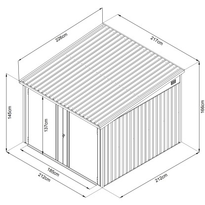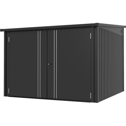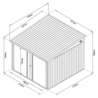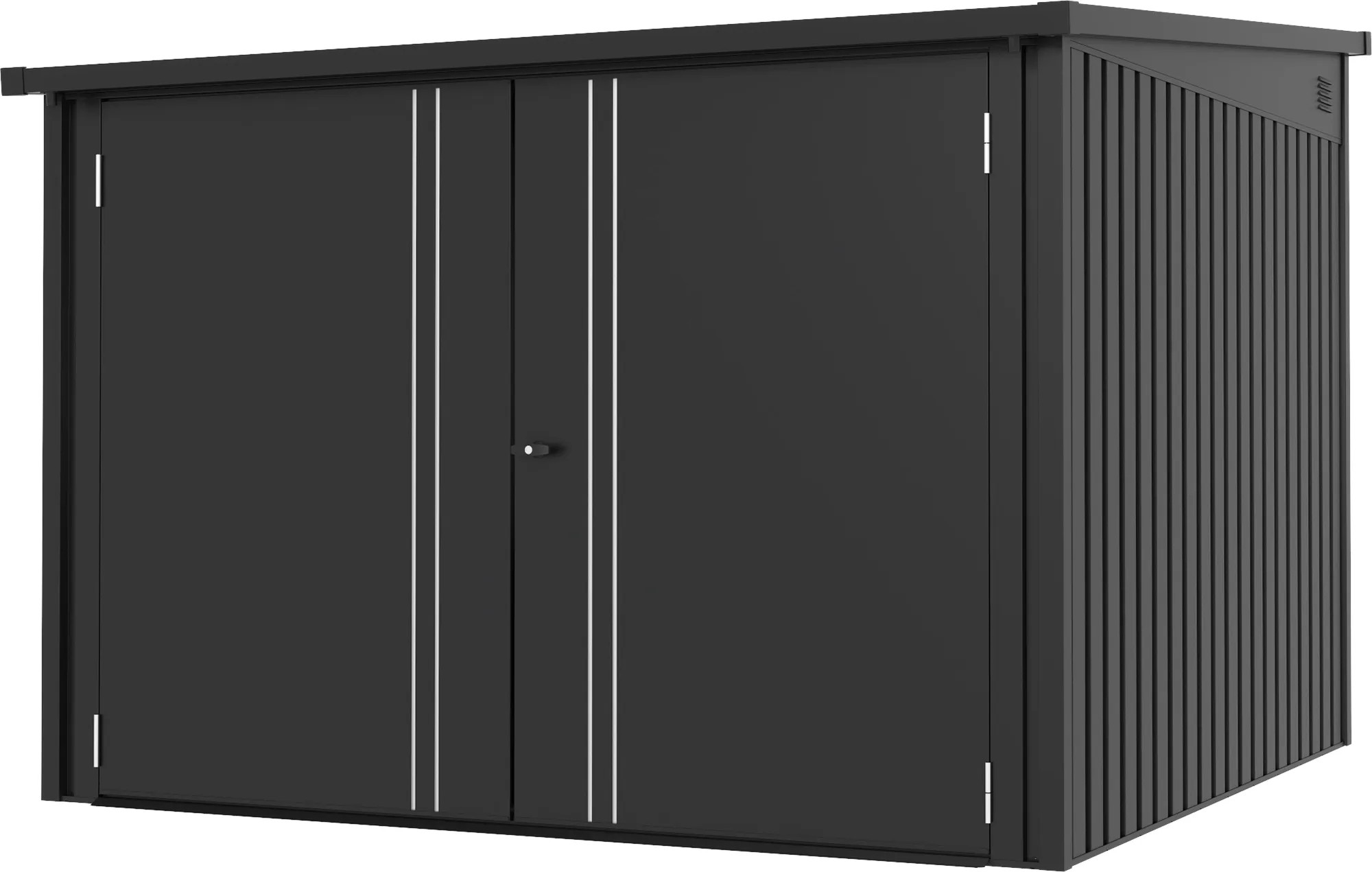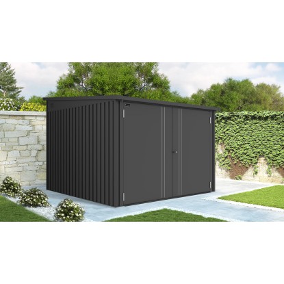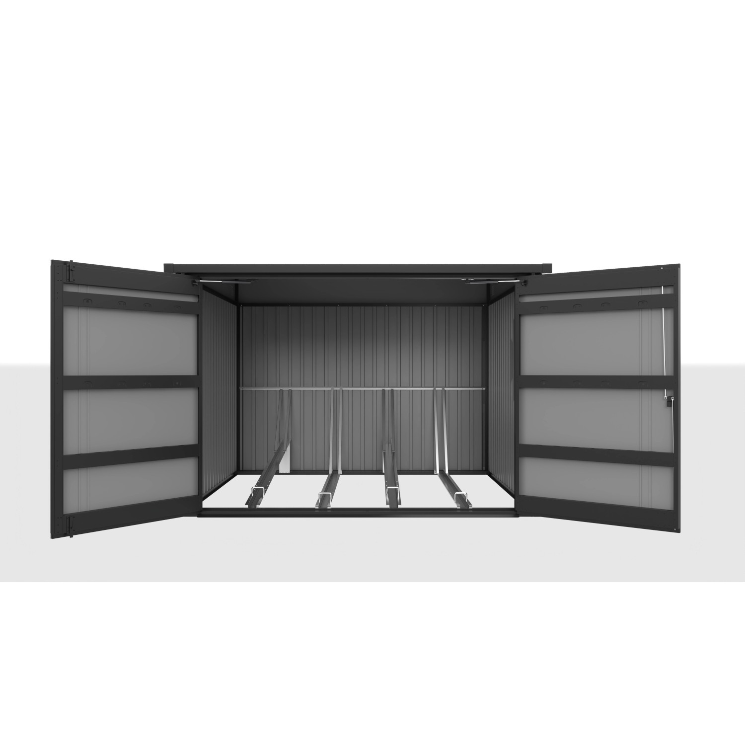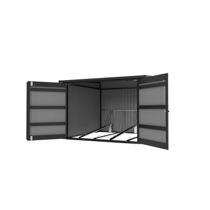 Garáž na kola z plechu v metalické šedé barvě poskytne místo pro 4 jízdní kola. Dvě větrací mřížky zajišťují dobré klima uvnitř garáže. Garáž má dvoukřídlé dveře s nízkým vjezdem s výškou dveří 137 cm. Zvenčí dveře zdobí 2 hliníkové proužky a uvnitř 4 háčky na nářadí. Dveře jsou uzamykatelné a jsou dodávány spolu s 2 klíči. Šikmá střecha je vodotěsná a odolá zatížení sněhem 100 kg/m2. Střecha má integrovaný dešťový žlab a 2 vývody vody. Součástí dodávky je montážní materiál pro uchycení k podkladu pro lepší stabilitu a 4 vnitřní kolejnice pro uchycení kol.