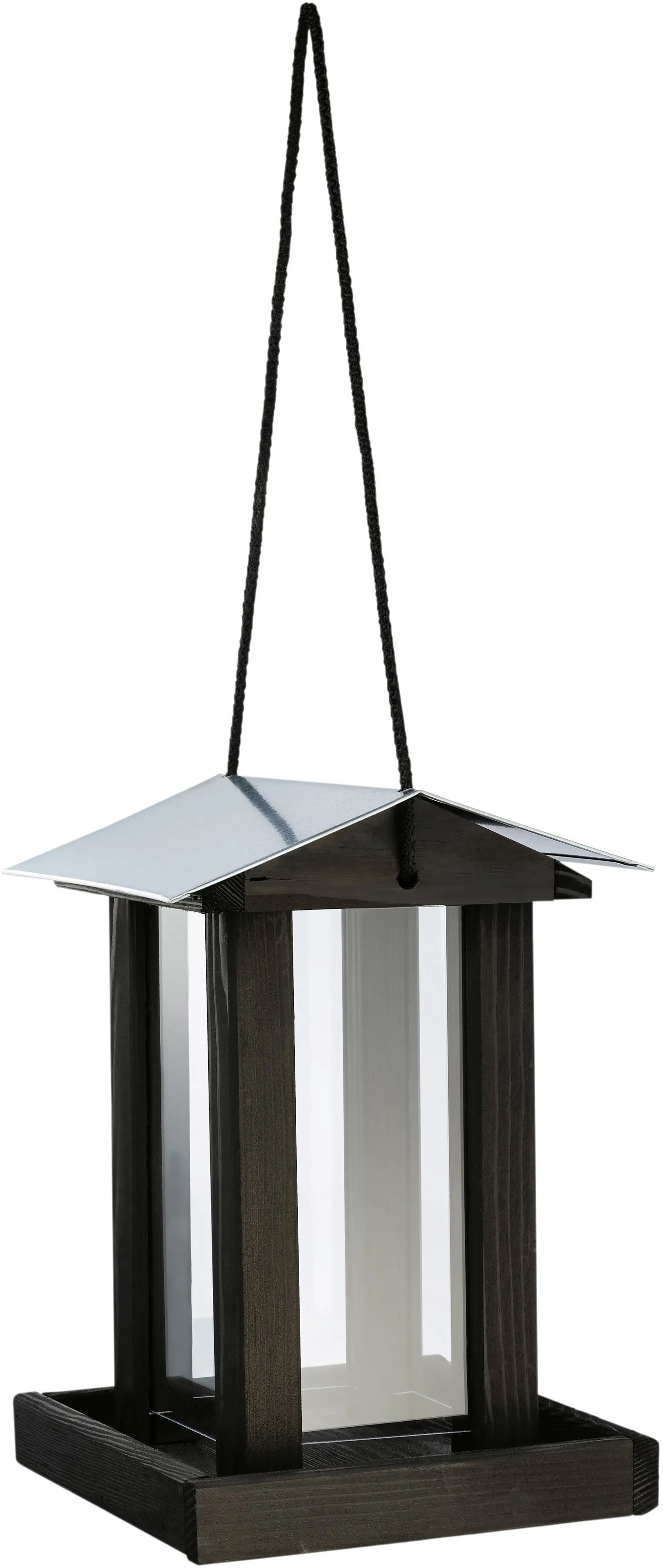 Krmítko pro ptáky, plexisklo, se zinkovou střechou, černé je vyrobeno z piniového dřeva a je opatřeno lazurou na vodní bázi. Strany tohoto krmítka pro ptáky jsou z plexiskla. Střecha je vyrobena ze zinku. Pomocí šňůry je možno krmítko pro ptáky pohodlně upevnit na stěnu nebo zavěsit.