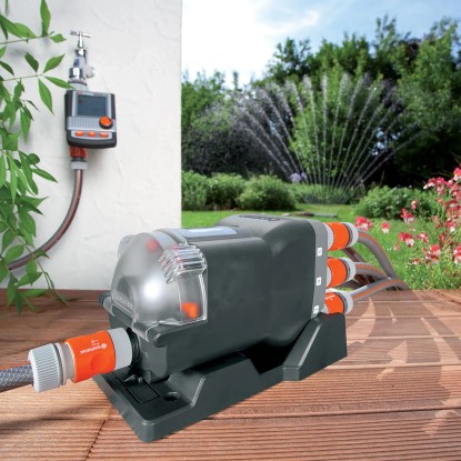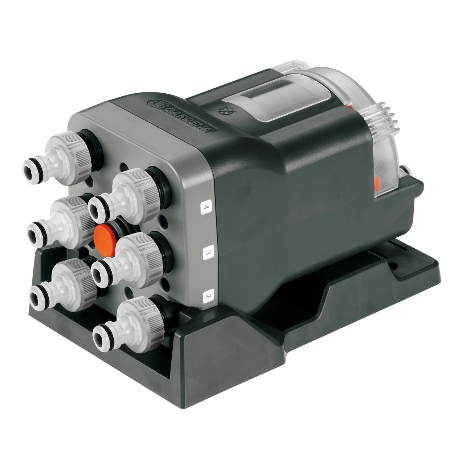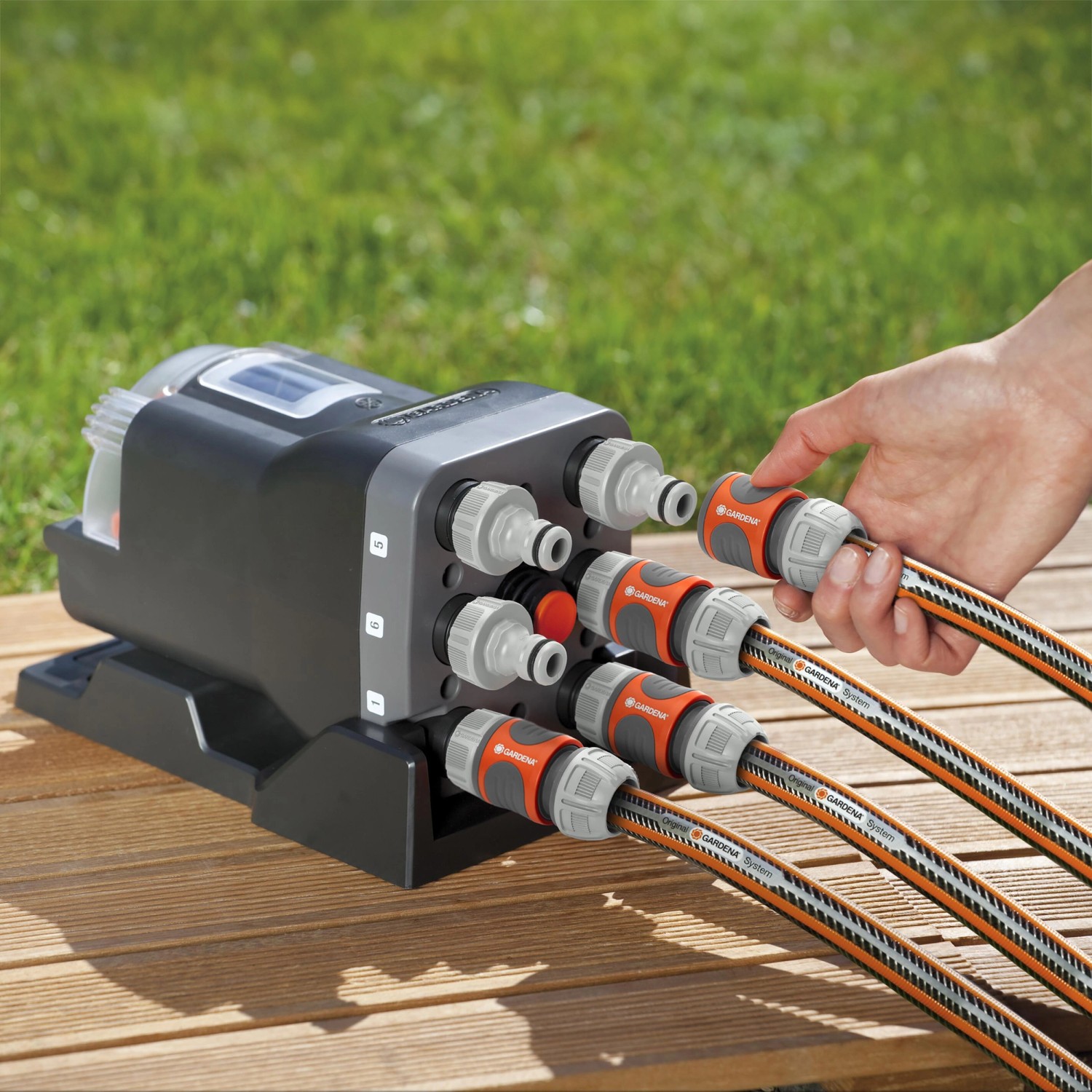 V kombinaci se zavlažovacím počítačem Gardena MasterControl nebo MasterControl solar, Gardena rozdělovač vody automatic zajišťuje automatické zavlažování až šesti různých oblastí zahrady, jednu po druhé. Například můžete zavlažovat trávník zavlažovačem, pak hrnkové rostliny, záhonky, živé ploty a truhlíky pomocí systému kapkové závlahy. Průtok vody automaticky otevře výstupy, jeden po druhém, v závislosti na naprogramování zavlažovacího počítače. Praktické: rozdělovač vody lze pružně přizpůsobit podmínkám ve vaší zahradě. To znamená, že můžete zavlažovat buď pouze dvě oblasti nebo až šest. Nepotřebné výstupy vody se jednoduše deaktivují pomocí páčky. Stejně jako různé rostliny v zahradě potřebují různé množství vody, lze také individuálně nastavit dobu zavlažování v závislosti na naprogramování zavlažovacího počítače. Rozdělovač vody dopraví požadované množství na správné místo. Toto inteligentní řešení je ideální, když není k dispozici dostatečné množství vody pro současné napájení všech koncových přístrojů. Jednoduše připojíte rozdělovač vody na zeď domu, nebo na zem. Protože jsou všechny vývody vody umístěny v jednom směru, zařízení zabírá velmi málo místa. Je vybaven vnějším závitem 26,5 mm (G 3/4) a je dodáván s pěti ks šroubení a třemi koncovými zátkami.