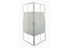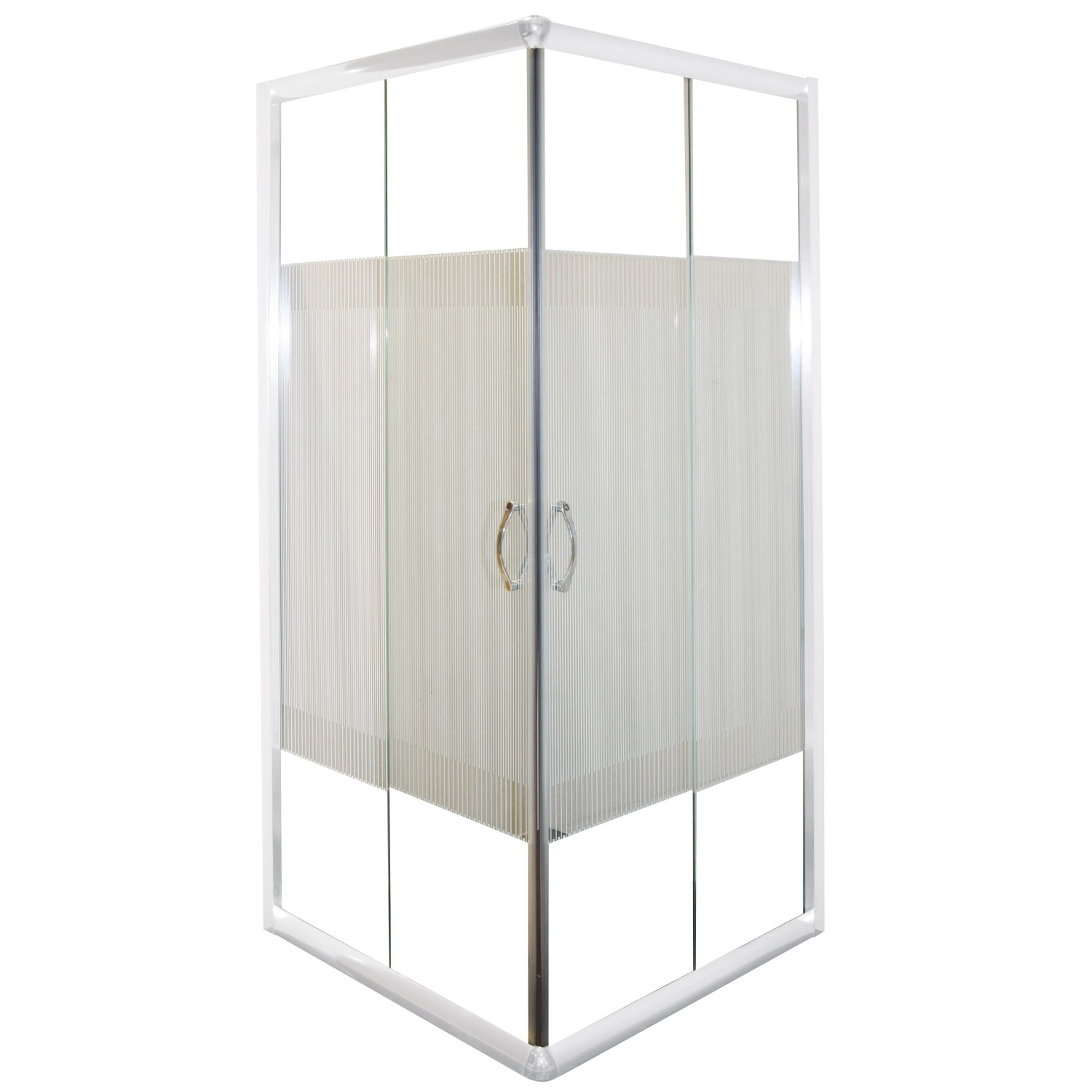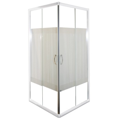 Sprchový kout bez vaničky s bílými profily s rozměry 90 x 90 x 180 cm. Dvojité posuvné dveře z 4 mm silného bezpečnostního skla jsou opatřeny vodoodpudivou úpravou. Částečně pruhované dveře poskytují soukromí. Silikonové těsnění dveří má magnetické proužky. Dveře jsou vybaveny dvojitými horními a jednoduchými spodními kolečky.