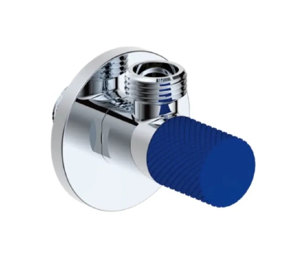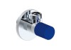 Rohový keramický ventil, mosazné tělo, modrá hliníková rukojeť s příjemnou manipulací, připojení M1/2"xM3/8".