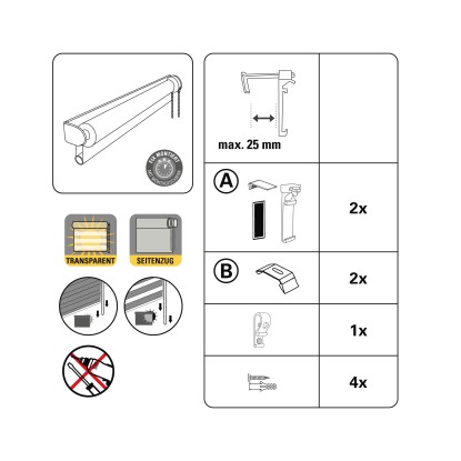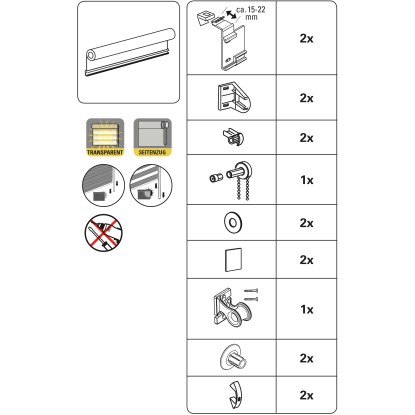 Rolety Gardinia EasyFix Double mají průměr návinu 18 mm a boční řetízkové ovládání s možností volby ovládání na pravé či levé straně. Rolety se instalují pomocí upínacích držáků přímo na okenní křídlo, lepením nebo případně šroubováním. Montáž pomocí upínacích držáků je možná pouze na okna s gumovým těsněním. Rozsah nastavení držáku je cca 15-22 mm (součástí balení).