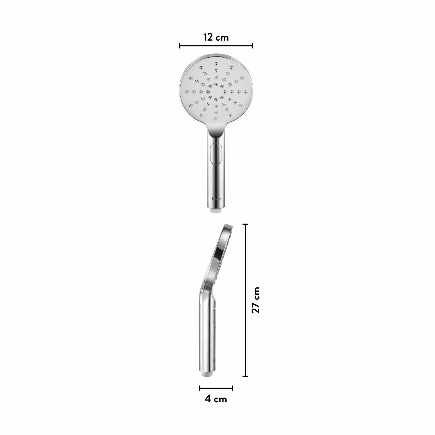 Ruční sprcha s tlačítkem, pochromovaná, se 3 režimi stříkání. S nopkami proti usazování vodního kamene, pro rychlé a jednoduché čištění. Vhodná pro všechny standartní sprchové hadice.
