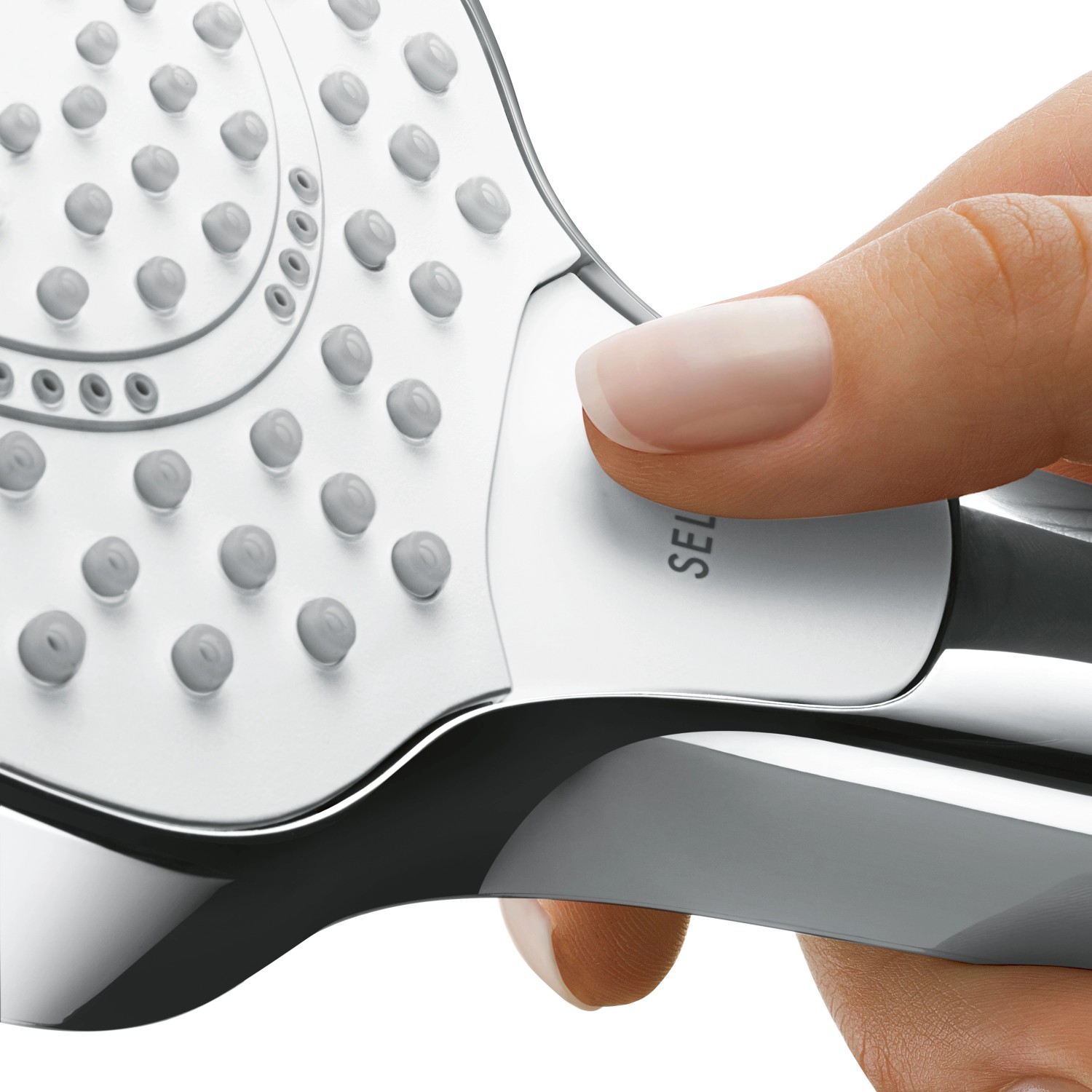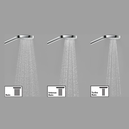 Sprchová hlavice Croma Select E Vario disponuje 3 různými typy proudů vody. Proud RainJet je jako příjemná velká přeháňka. Silný, koncentrovaný proud IntenseRain má relaxační účinek a uvolní napětí v ramenou a šíji. Hledáte příjemné osvěžení? S intenzivním proudem vody TurboRain to není žádný problém. Všechny typy proudů vody u ruční sprchy Croma Select E Vario snadno nastavíte stisknutím tlačítka (Select).