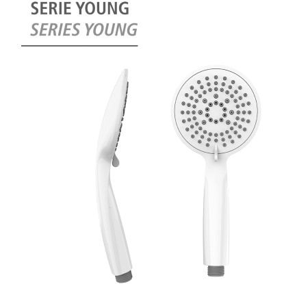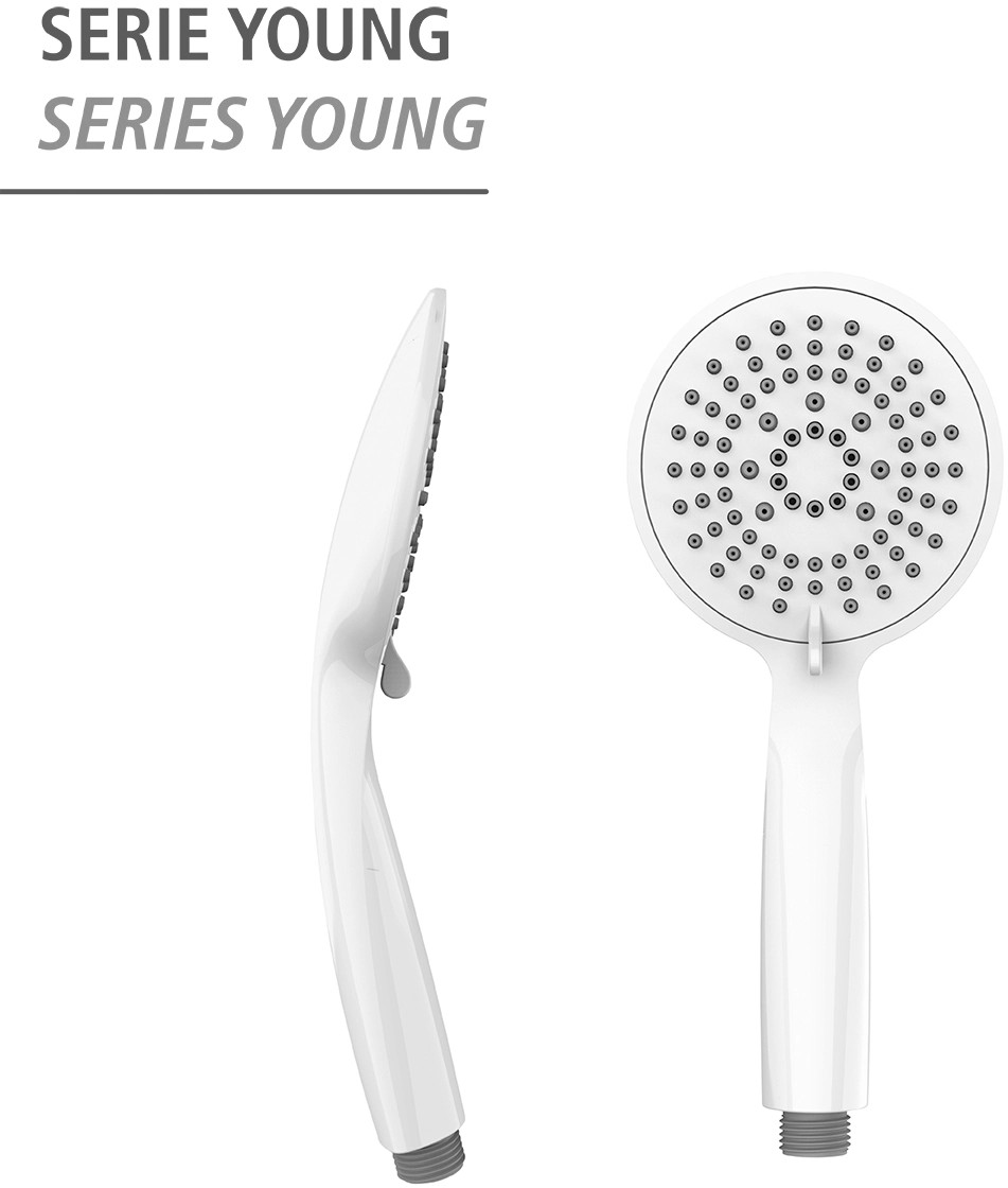 Komfortní sprchová hlavice má univerzální připojení 1/2" a je samozřejmě vhodná i pro průtokové ohřívače vody. Všechny ruční sprchy řady Young mají samostatný vnitřní přívod vody a jsou vyráběny v souladu se směrnicemi KTW a W270.