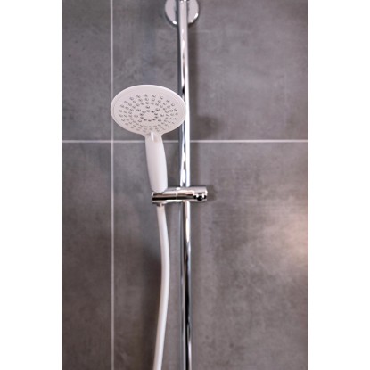 Sprchová hlavice je vyrobena z odolného ABS plastu a je vybavená praktickými nopky, které zajistí snadné čištění vodního kamene. Případné usazeniny vodního kamene na tryskách lze jednoduše setřít prsty.