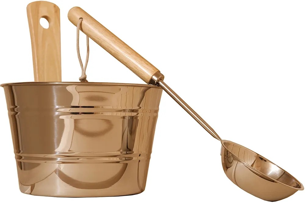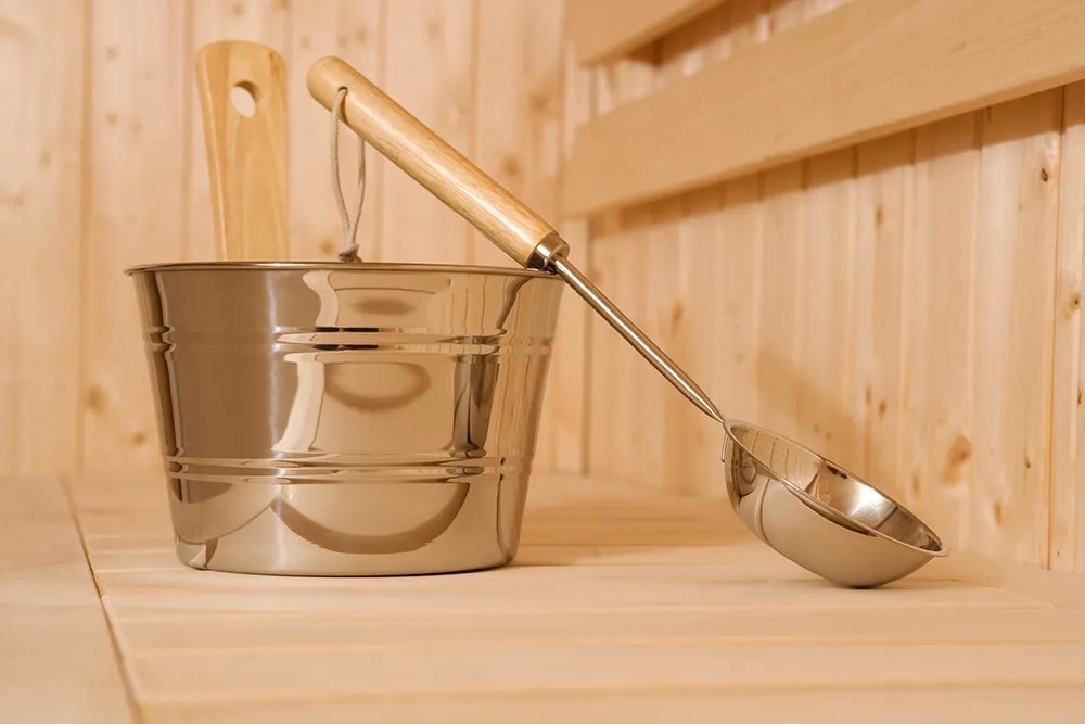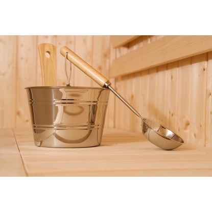 Moderní sada příslušenství z nerezové oceli představuje kontrast k sauně ze dřeva. Vyznačuje se svěžím a moderním vzhledem a splňuje užitečné funkce.