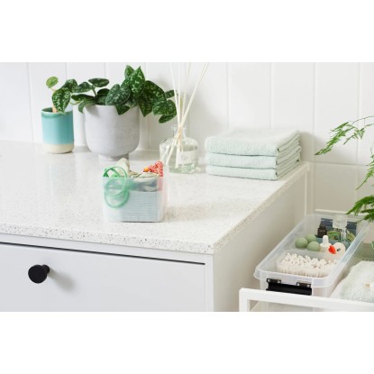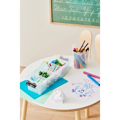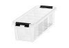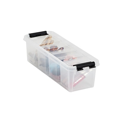 Tento praktický úložný box s úzkým profilem je dodáván se čtyřmi vložkami, které jsou ideální pro udržení malých předmětů uspořádaných a snadno dostupných. Box je stohovatelný s nasazeným víkem a silné klipy zajišťují pevné uzavření víka.