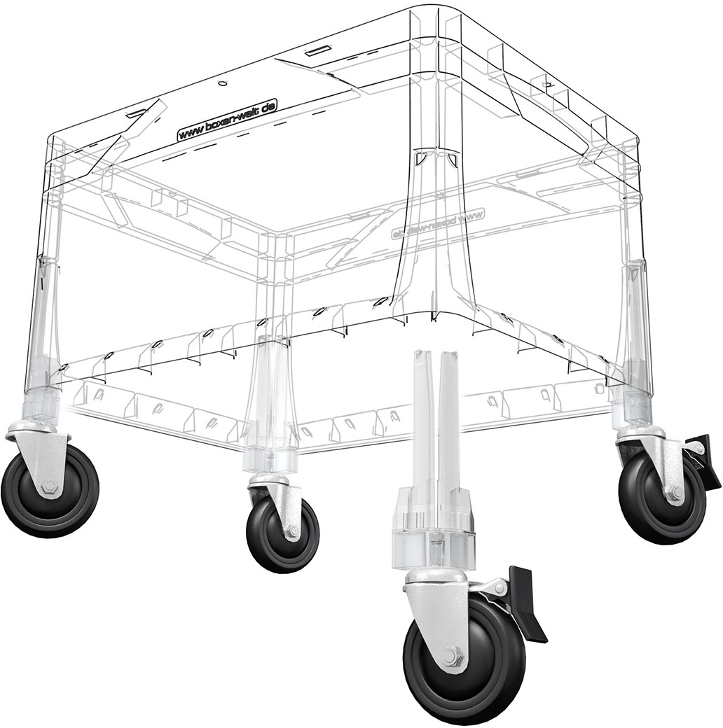 Eurobox systém nasazovací kolečka umožňují pohodlné skladování euroboxů. Ke spojení koleček s boxem je zapotřebí jednoho úkonu. Sada nasazovacích koleček obsahující vždy 4 kusy je kompatibilní s euroboxy se základním rozměrem 400 x 300 mm a 600 x 400 mm. Podle různých oblastí použití a namáhání můžete vybírat mezi sadou Home, Profi a Outdoor. Dodržujte nosnost nasazovacích koleček.
