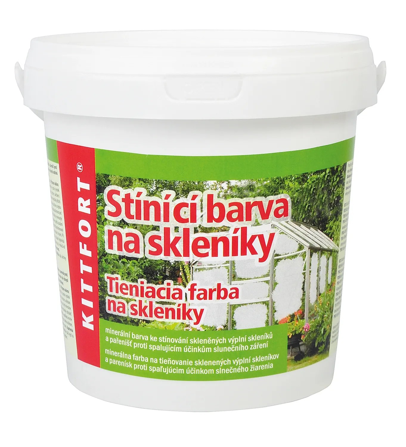 Kittfort stínící barva na skleníky je minerální barva ke stínování skleněných výplní skleníků a pařenišť proti spalujícím účinkům slunečního záření. Barva je vyráběna v bílém odstínu a k tónování do různých odstínů doporučujeme použít práškové minerální pigmenty Kittfort Primatón, které nabízejí různé odstíny.