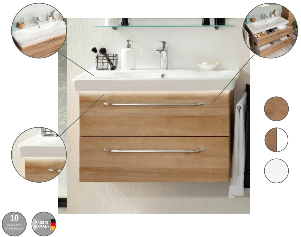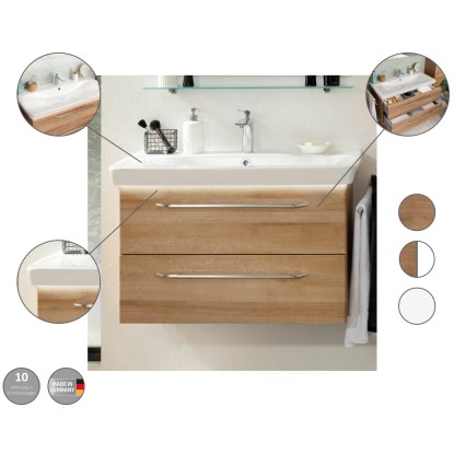 Série koupelnového nábytku FACKELMANN MILANO zaujme svým harmonickým, atraktivním a vkusným designem v příjemných a uklidňujících barvách. Koupelnový nábytek série MILANO je k dispozici ve 3 barevných provedeních - bílá ve vysokém lesku, sukatý dub a kombinace bílá ve vysokém lesku a sukatý dub. Korpusy skříněk mají matnou bílou barvu a příčky a zadní stěny mají stříbrnošedou barvu. Veškerý koupelnový nábytek série MILANO lze jednoduše kombinovat dle libosti mezi sebou. Kromě koupelnového nábytku v této série naleznete také umyvadla, doplňkové osvětlení a zrcadla.
