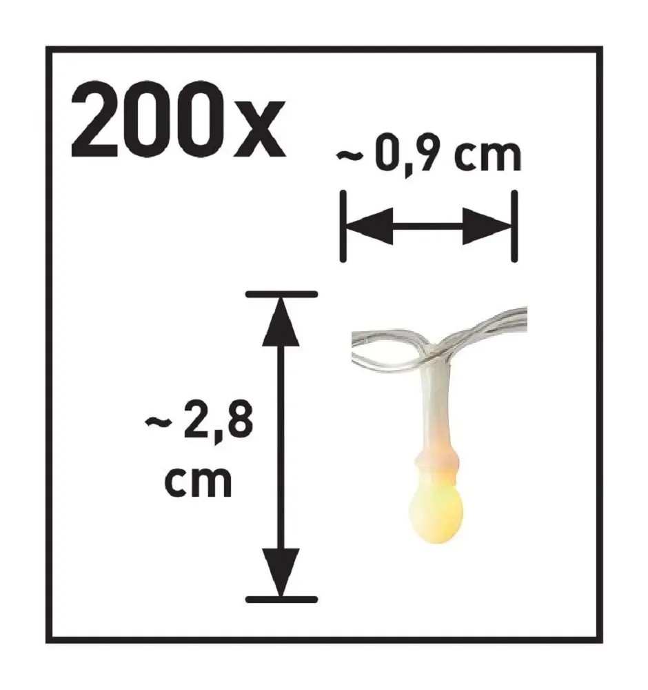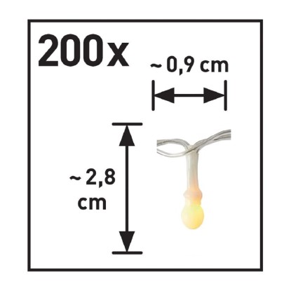Tento VLC ALERIA světelný řetěz se svým stupněm krytí IP44 je vynikající volbou k osvětlení venkovního prostoru. LED světelný řetěz je nejen praktický, ale i dekorativní. Je vybaven 200 LED žárovkami o průměru 0,9 cm a výšce 2,8 cm s možností změny barev RGB s různými režimy svícení a časovačem 6/18 h. Světelný řetěz má celkovou délku 7,97 m z toho 2 m je přívodní kabel a 5,97 m je osvětlená délka. Řetěz je provozován na 3 x AA baterii. Baterie nejsou součástí balení.
