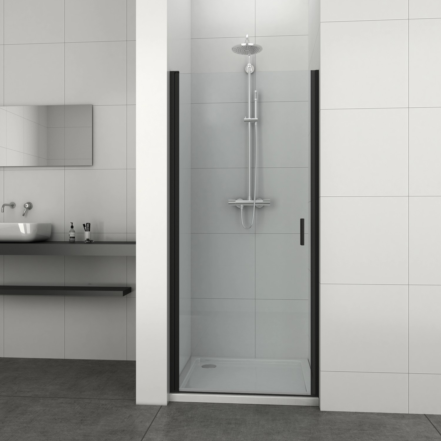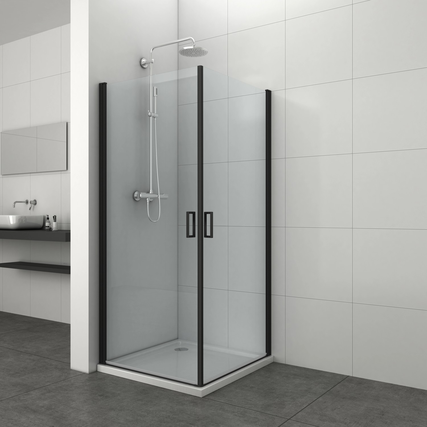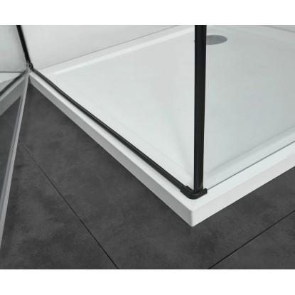 Dveře jsou opatřeny kovovými madly v černé barvě. Nástěnné profily lze nastavit v rozsahu 2 cm, tím je při montáži zajištěna větší flexibilita a můžete tak jednoduše vyrovnat šikmé stěny. Panty se zdvihovým mechanismem se při otvírání nadzvednou a při zavírání klesnou a zajišťují tak vysokou těsnost koutů.