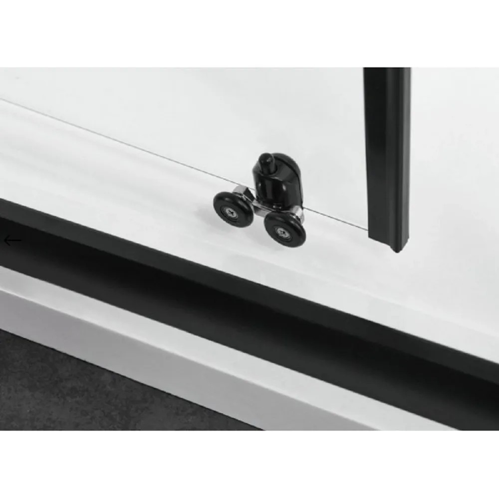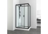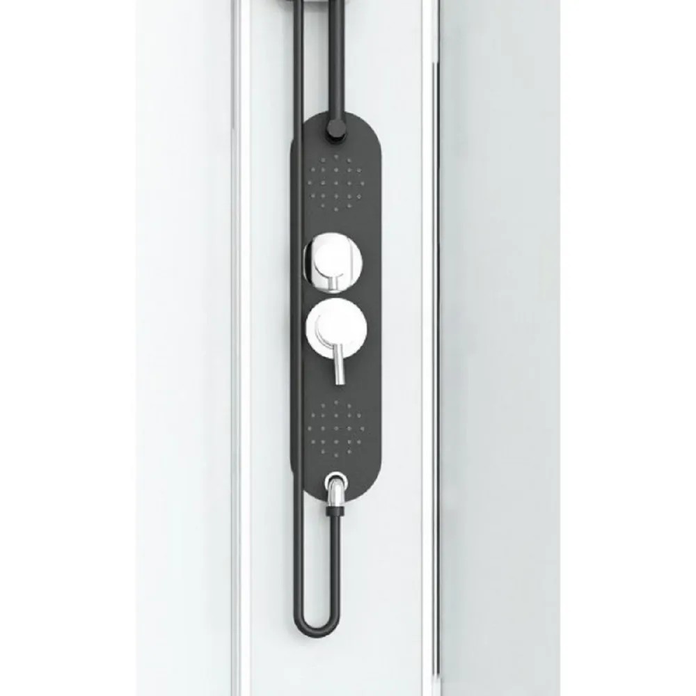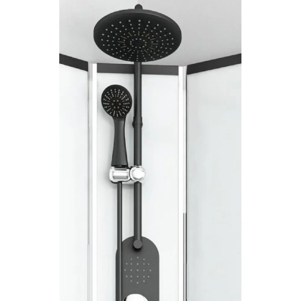 Kompletní sprchový s jemným a moderním designem má matné černé hliníkové profily. Celkový vzhled doplňují ruční sprcha a sprchová hadice taktéž v černé barvě. Sprchový kout má přední skla a dvířka z 5 mm silného čirého bezpečnostního skla. Zadní stěnu tvoří 4 mm silná bílá skleněná tabule. Páková baterie s přepínačem umožňuje oddělené používání hlavové a ruční sprchy. Ruční sprcha disponuje 3 typy proudů pro opravdový odpočinek. Hlavová sprcha s jedním typem proudu se postará o nádech luxusu.